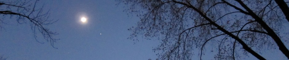 This past week, while walking out to get the newspaper well before the sun was up, I glanced up to see the moon in the western sky, hanging in blackness with its current partner Jupiter, appearing like a small star below. I took a photo as it appears in the header of this blog.