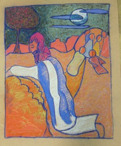 I created this image in collaboration with Sunday School students who drew the outline of a bible story that I enhanced with pastels. Christ praying in the Garden of Gethsemane. By Christopher Cudworth with Gwen Zeiter.