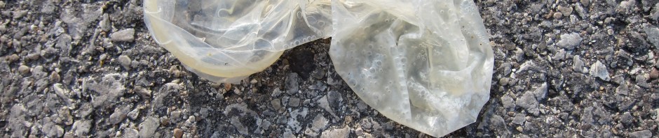 That’s what we find when we run and ride on a Sunday morning or a Tuesday afternoon. Someone’s been out having fun in the car and tossing aside the evidence. Condoms. Weenie jackets. Prophylactics. Doesn’t matter what you call them. They’re always sort of shocking when you find them used and discarded. Even an empty condom package has a story behind it. We dare not imagine it. Not on our own. Too often we are jealous creatures.