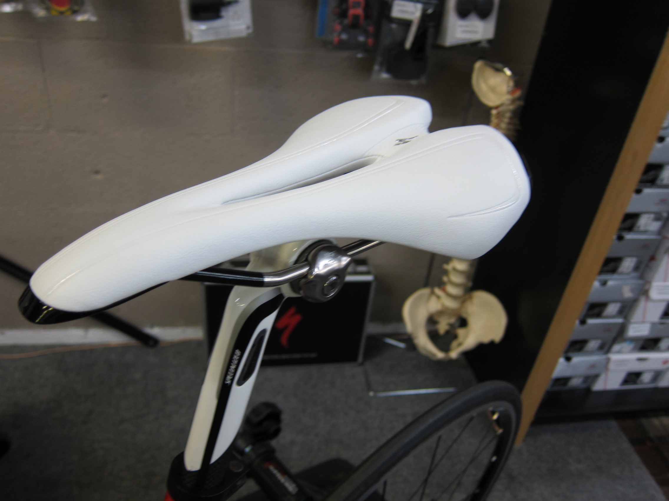 That meant we installed a new white Specialized seat post with Zertz inserts. Then on a whim I picked out a new white saddle to boot. My original saddle that came with the bike had originally been exchanged for a Specialized saddle with a split up the middle. That saved the “unit” from going numb. That saddle still worked, but it turned out my appetite for a new feel with the bike included a new saddle, and a new look. A little narcissism is part of the bike scene after all.