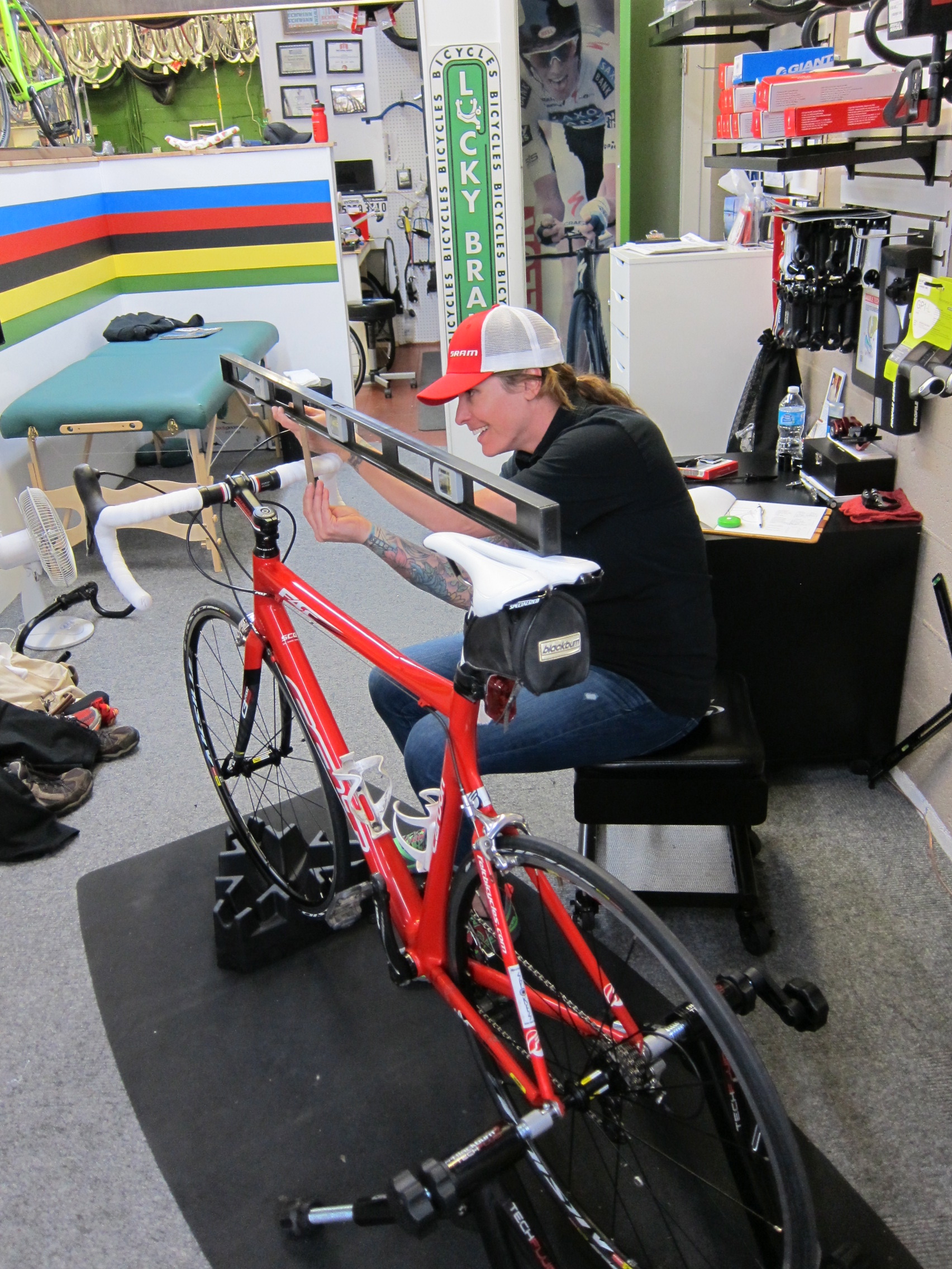 It was fruitful, and it was also fun getting a bike fitting with Karrie Ozyuk. It so happens she has a great personality for the job. She asks lots of questions. Studies the issues at hand, sometimes literally. The certificates on the wall from Specialized make you feel a bit like you’re at the doctor’s office. In a manner of speaking, you are. A Dr. of Bike Fit, she is.