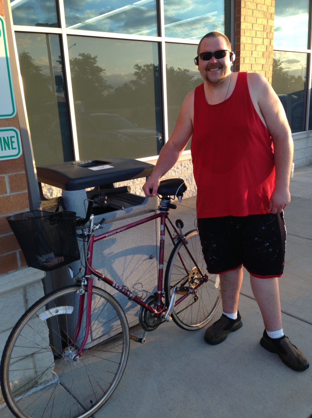 He’s anything but tiny. His real name is Kevin, but I don’t know any more about him other than what he told me about liking to ride his newfound friend, a Schwinn bike that had been sitting in the garage of a friend. The friend was going to give the bike away or sell it, and Tiny decided he wanted that bike. “I’ve always liked to ride,” he told me outside the Walgreen’s store in Batavia where he’d parked the bike while going inside to get some cigarettes and a Gatorade. “So I asked him for the bike.”