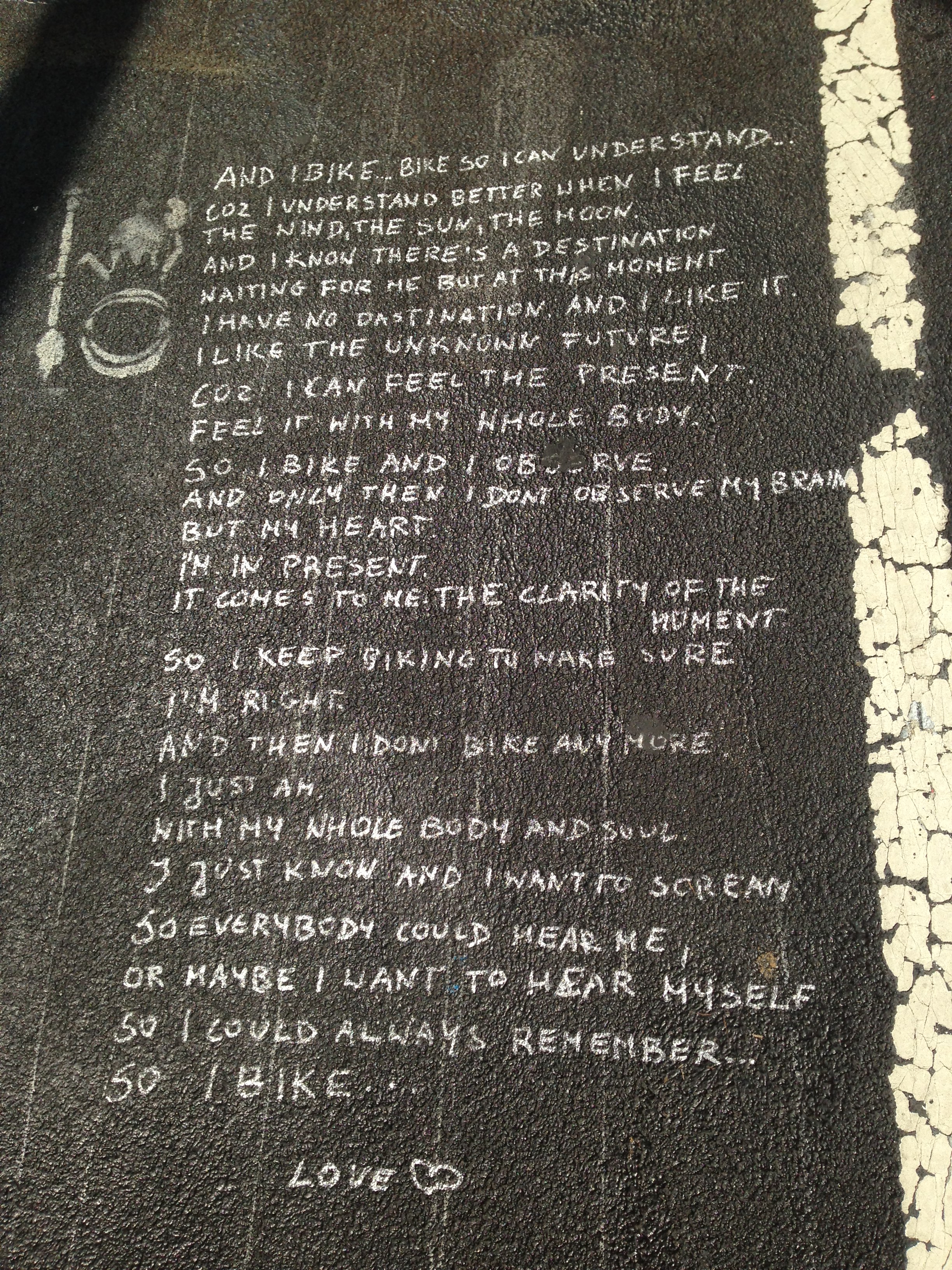 So I keep biking to make sure I’m right. And then I don’t bike any more. I just am with my whole body and soul. I just know and I want to scream so everybody could hear me, or maybe I want to hear myself so I could always remember…So I bike. Love. (heart sign)”