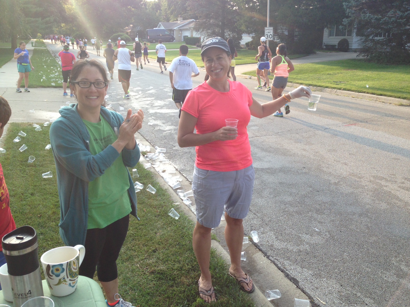 The inside joke was one of many fun interchanges between competitors and volunteers. At the same aid station one runner carried his water cup with him looking for a trash can. “I can’t bring myself to litter!” he said, staring down at the array of emptied cups laying on the grass and street. “We’ll pick it up!” a volunteer called after him.