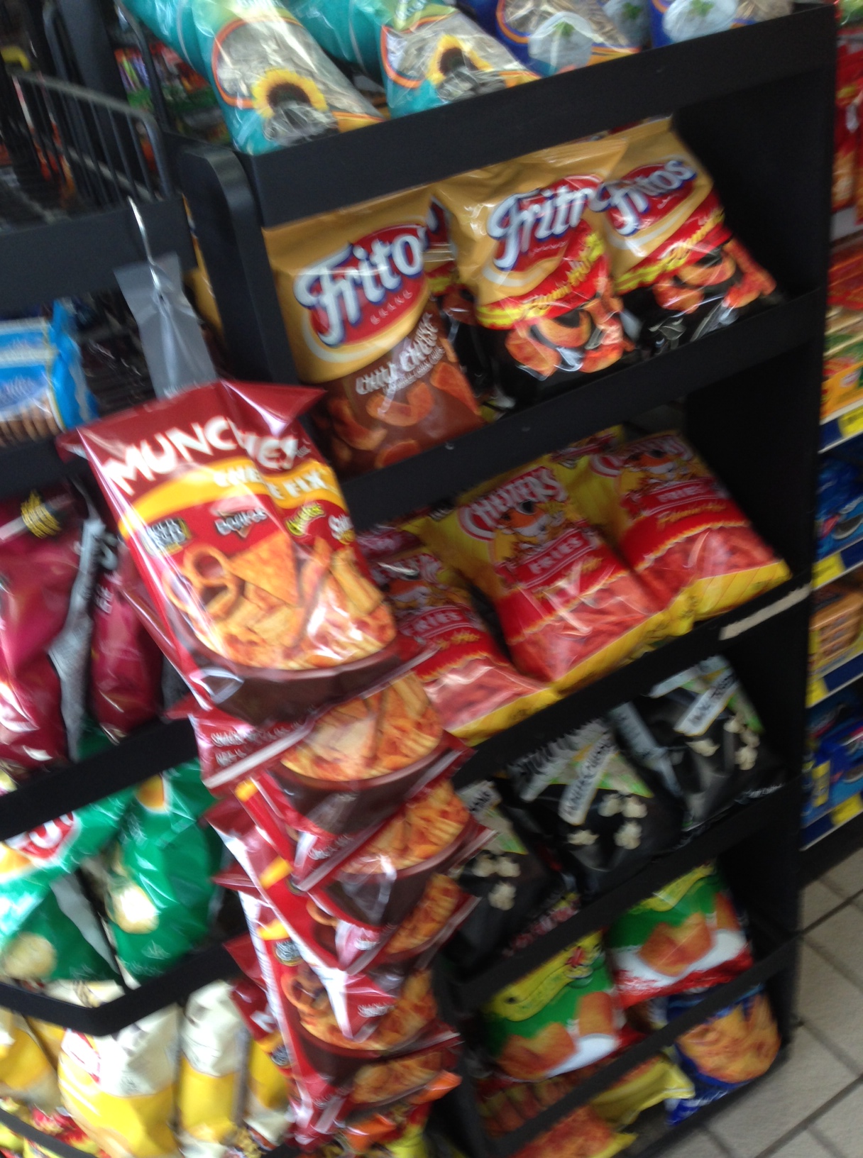 Shifting from foot to foot I noticed a sign below the tall stack of snack foods forming a wall at the front of the store.