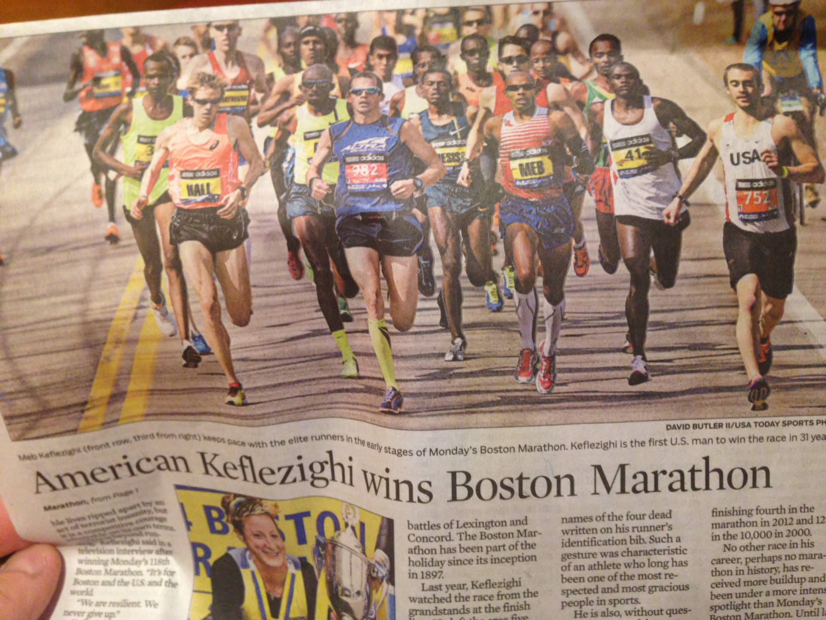 Opening the Chicago Tribune the morning after the Boston Marathon, I read a wonderful article by Philip Hersh, one of the leading sportswriters in America. Not only was the article beautiful, so was the photo inside. The shot of the lead group flying through the early stages is such a wonderful illustration of what the race is all about.