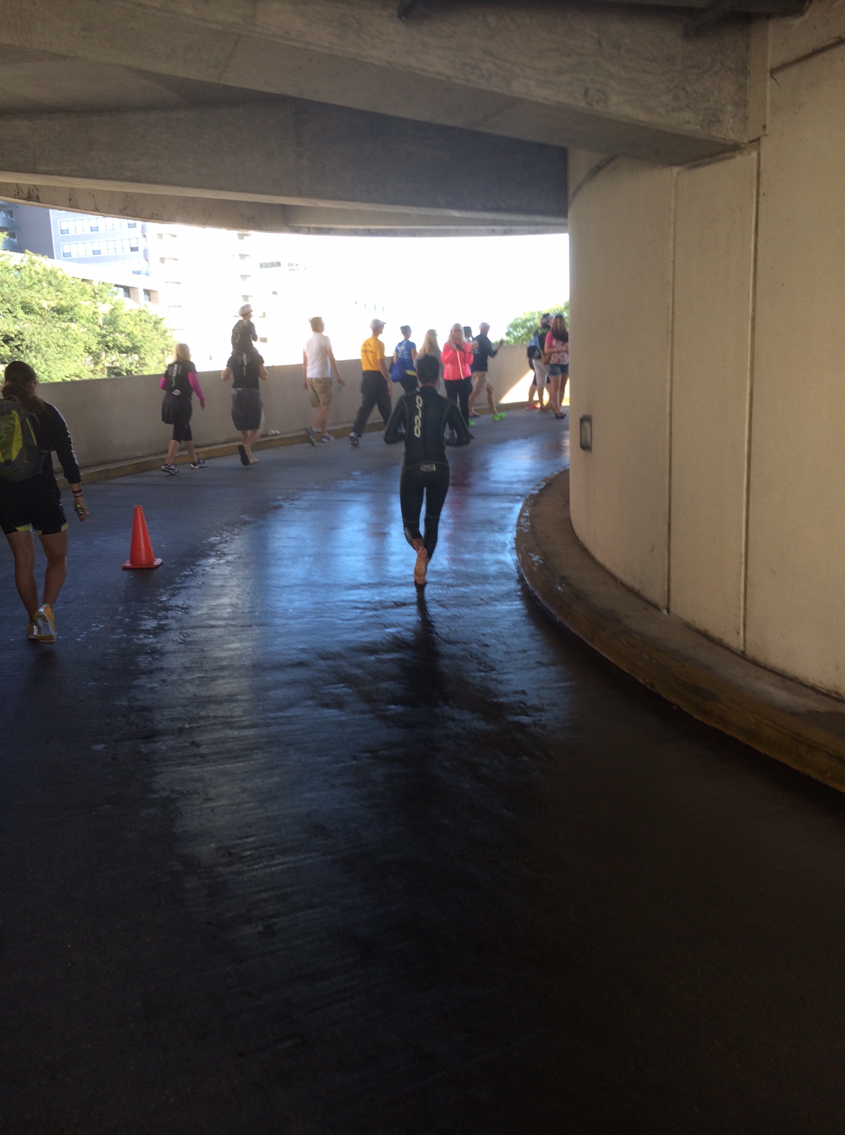 An Ironman competitor runs up the spiral transition zone from the lake to the parking deck and bike racks.