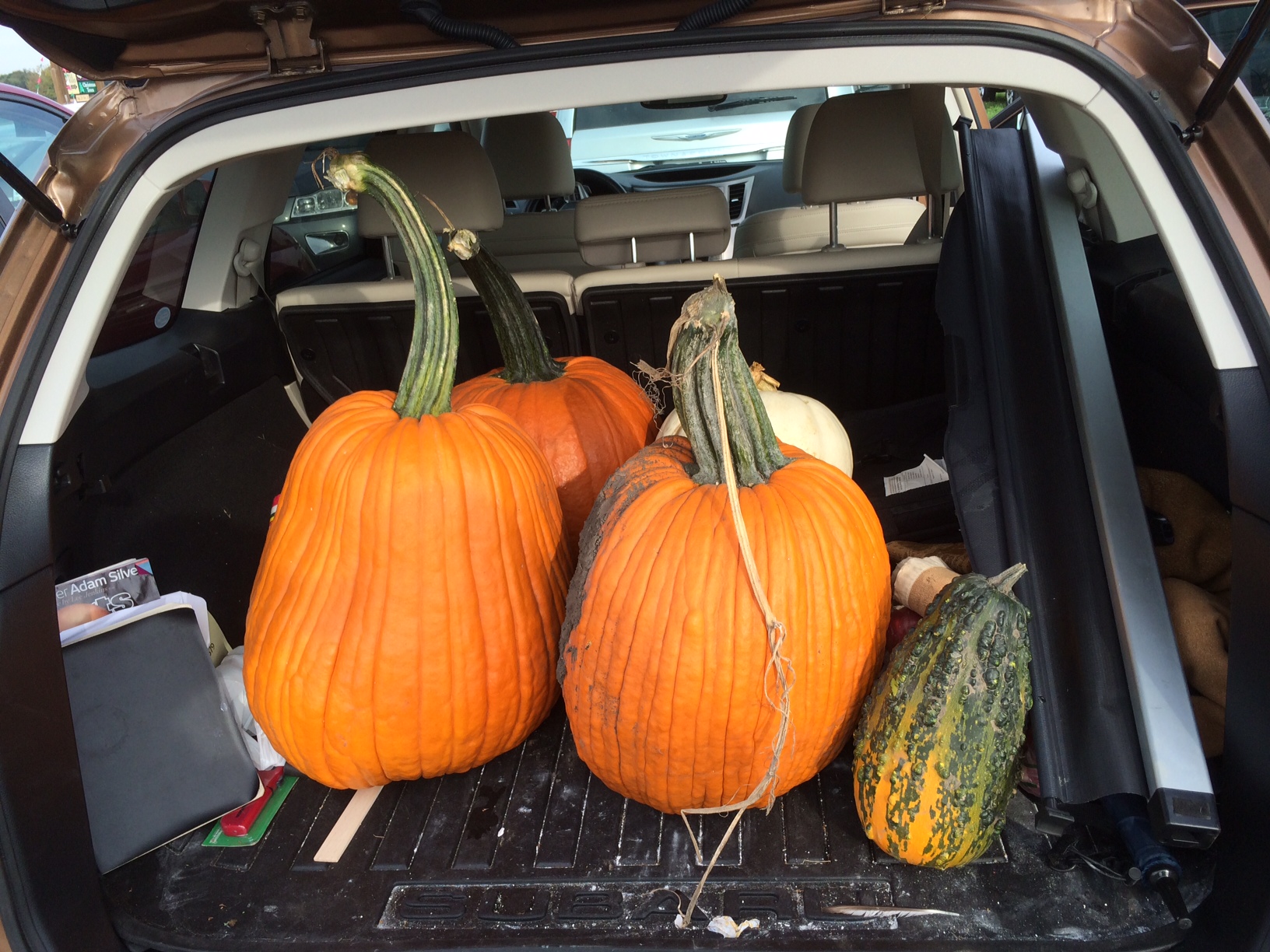 The pumpkins at Kuipers in fact looked like they were raised on other-worldly fare. The stems were huge and phallic. The bodies of those gourds stood two feet tall in some cases. There was a fecund quality to all of them, an inspiration in some ways to me. They cost 39 cents a pound and we bought three of them and stored them in the back end of the Subaru. We came home with $100 worth of popcorn, apples and apple cider donuts. So goddamnit, we went big and we went home. Who says you can’t do both? That’s how we’ve got to roll in this world.