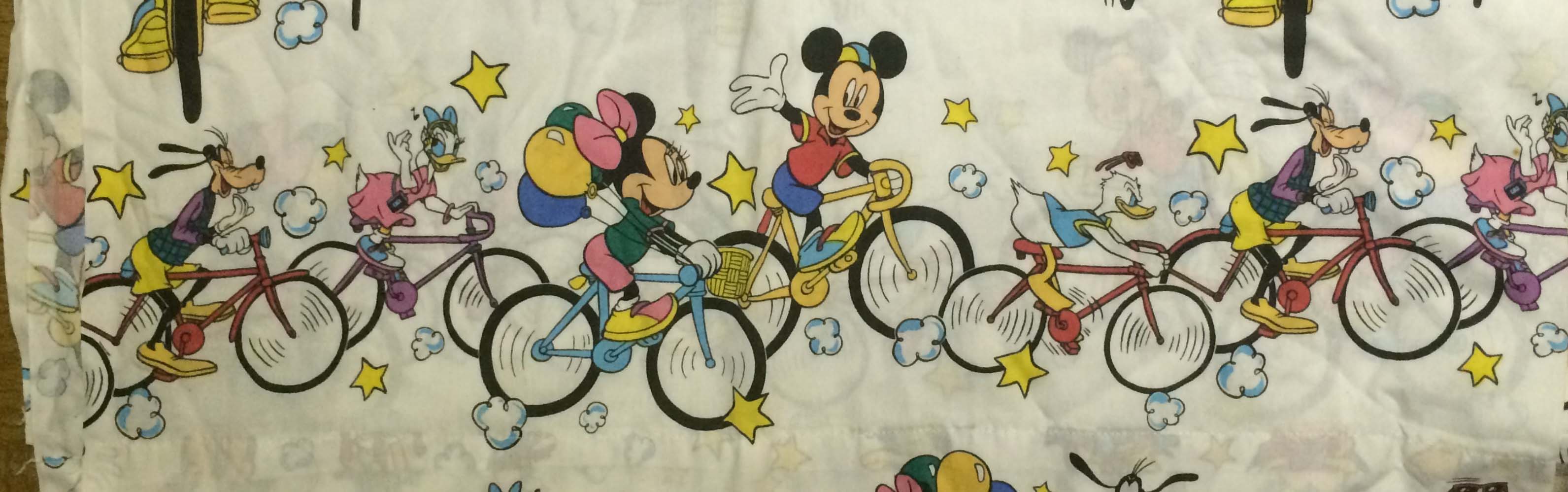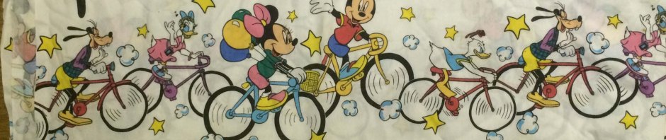 I did not recall that we actually purchased bedspreads featuring Goofy as well. Yet while cleaning out the basement during the holiday break, I pulled a giant bedspread out and was struck by the image that lay there before me. It was a big picture of Goofy on a bike!