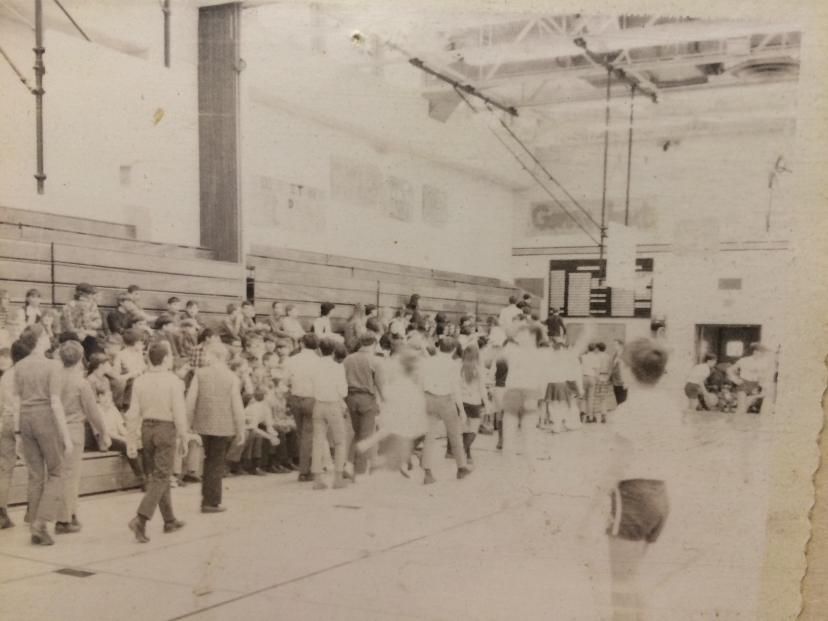 Warming up for the 7th Grade basketball championship.That’s me with the arm flying back after taking a shot.