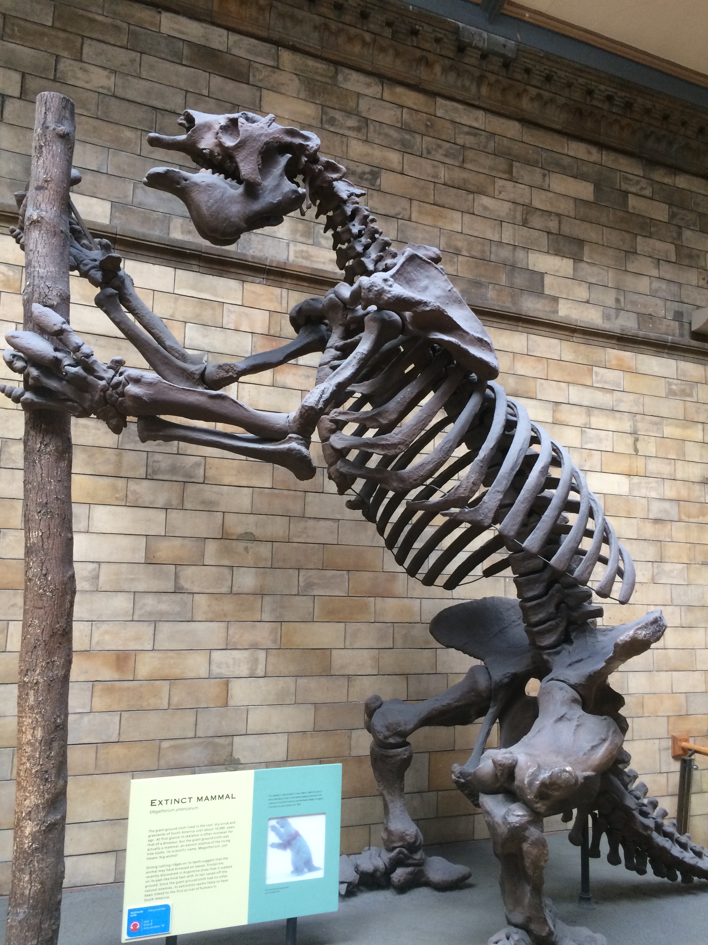 A fossilized giant sloth assumes the position to pray to yet another pointy thing in the British Museum of Natural History.