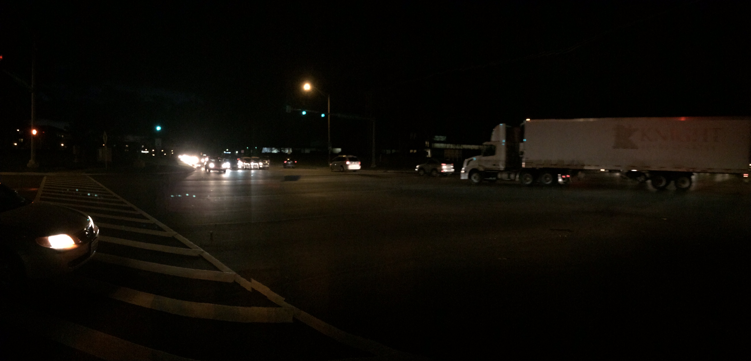 Yesterday I ran at dusk. As I approached a major intersection a mile from my home, I stopped to take a panorama of the traffic waiting to move in the growing darkness.