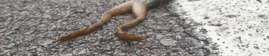 Starting up the drive from the cul de sac where we lived, I noticed frog after frog smashed on the road. Reaching the main street, the number of dead frogs increased. By the time I turned onto Orchard Road, a four-lane tributary that feeds into the Interstate a mile away, there was frog grease everywhere.