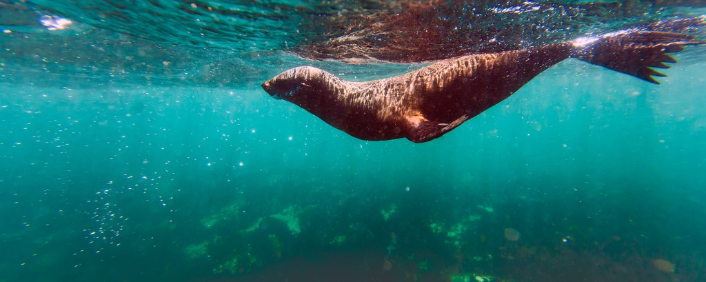 I haven’t swum much in the ocean or cavorted with otters in the kelp beds, but at one point the gal in my lane did a flip turn and surfaced much like a seal creature in the water. Her movement in her black suit was elegant. I half expected to see a flipper break the surface. Well, actually it did. She was wearing those little half-flippers for some of her intervals.
