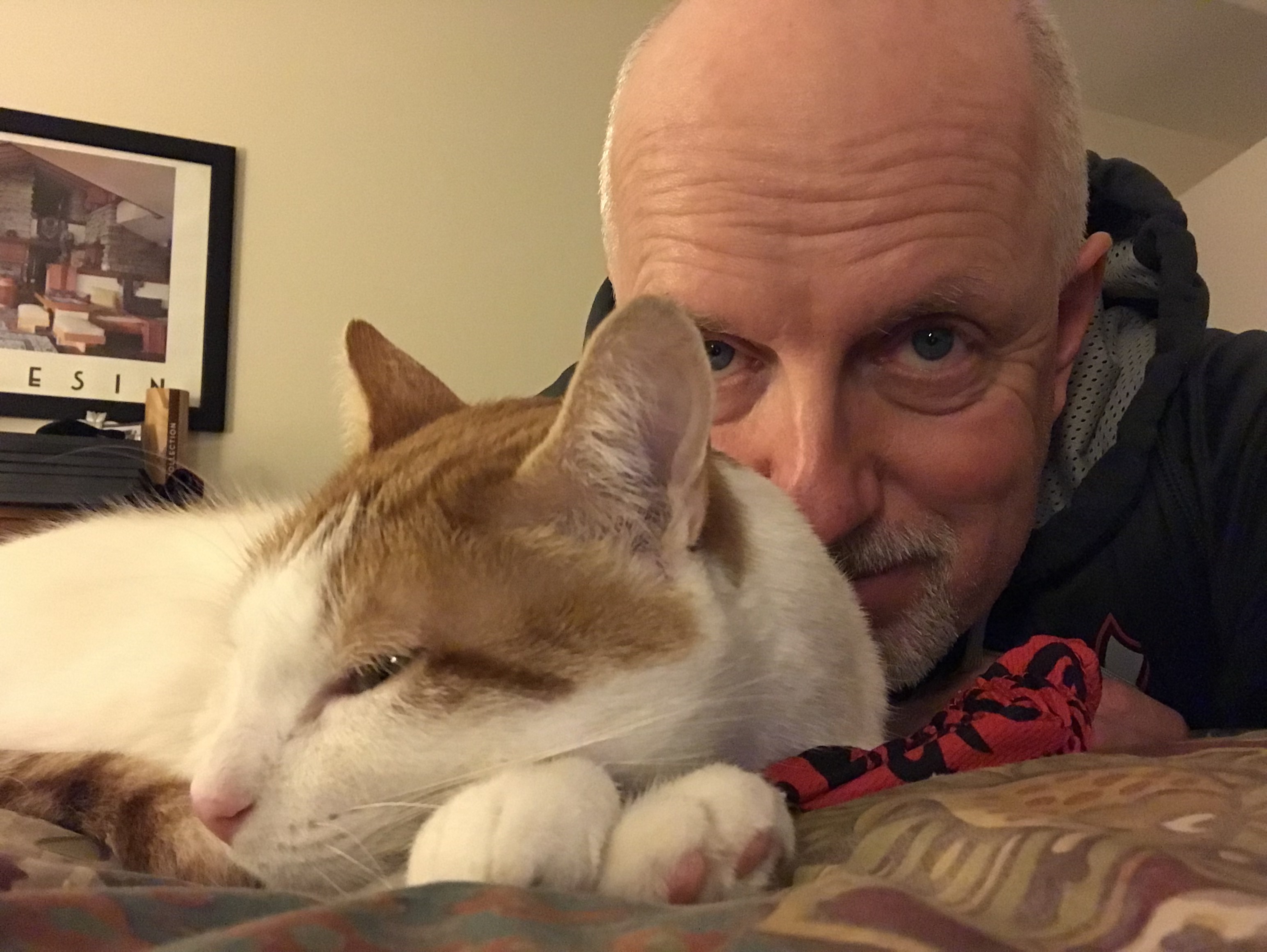 Instead, I learned, once Sue got home, that our cat Bennie had caught and captured a mouse in the basement. He apparently played with it a while and then deposited it on the landing where it could not be missed. A gift, it seems, for the woman that he loves.
