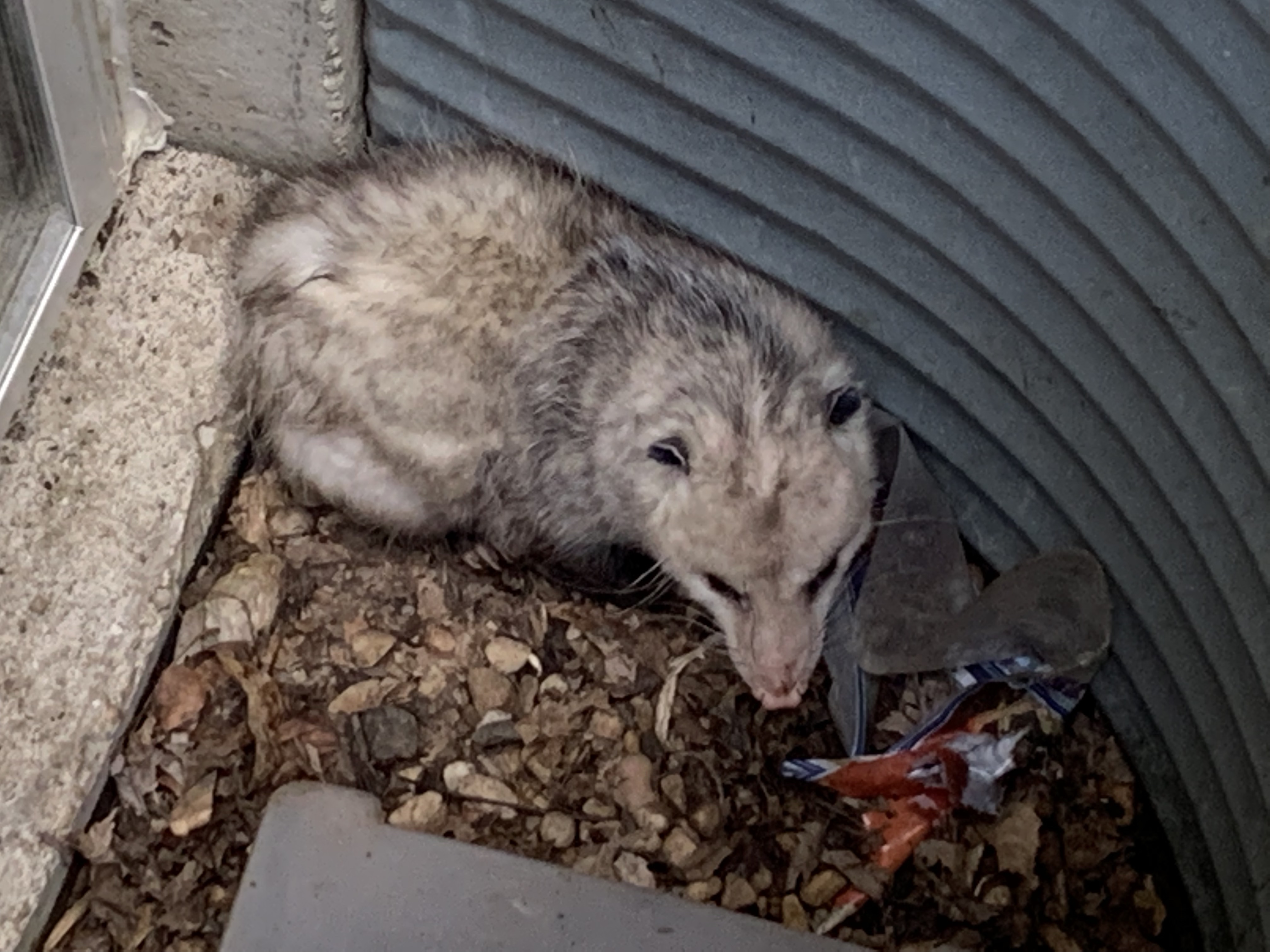 Two nights ago the opossum apparently climbed into the bin to gorge itself on the sweet smorgasbord of plant protein. Unfortunately the bin must have tipped and dumped the opossum into our five-foot-deep window well. There is slept the day away despite its circumstance. The lifespan of most opossums is not much longer than four years, if they’re lucky. Many die as road kill or are attacked by owls or other predators. Some just starve or freeze to death.