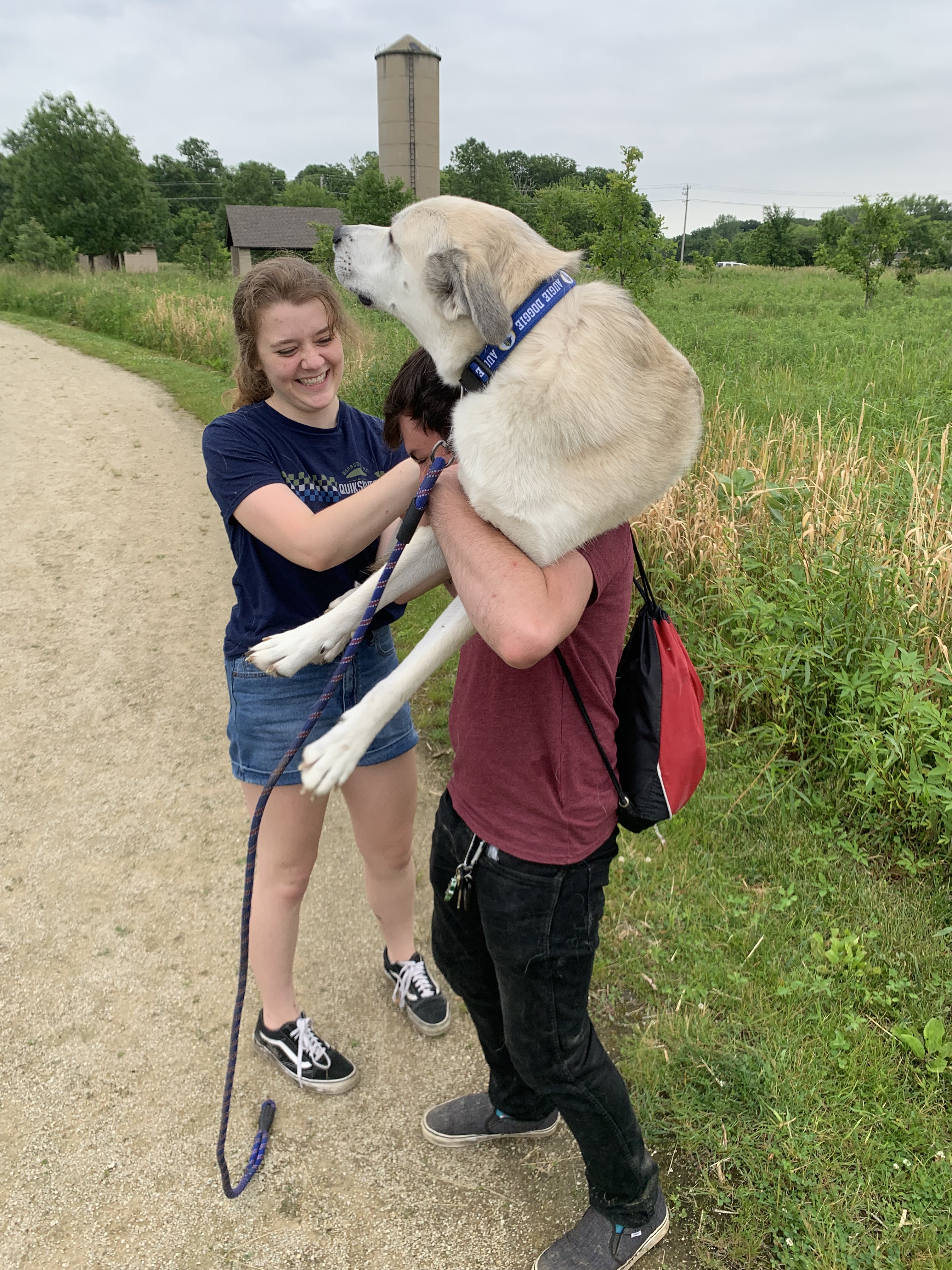 Augie’s reticence to go back home meant that Max needed to get Augie back on his shoulders for the last one hundred yards to the parking lot. Megan helps position the pup…