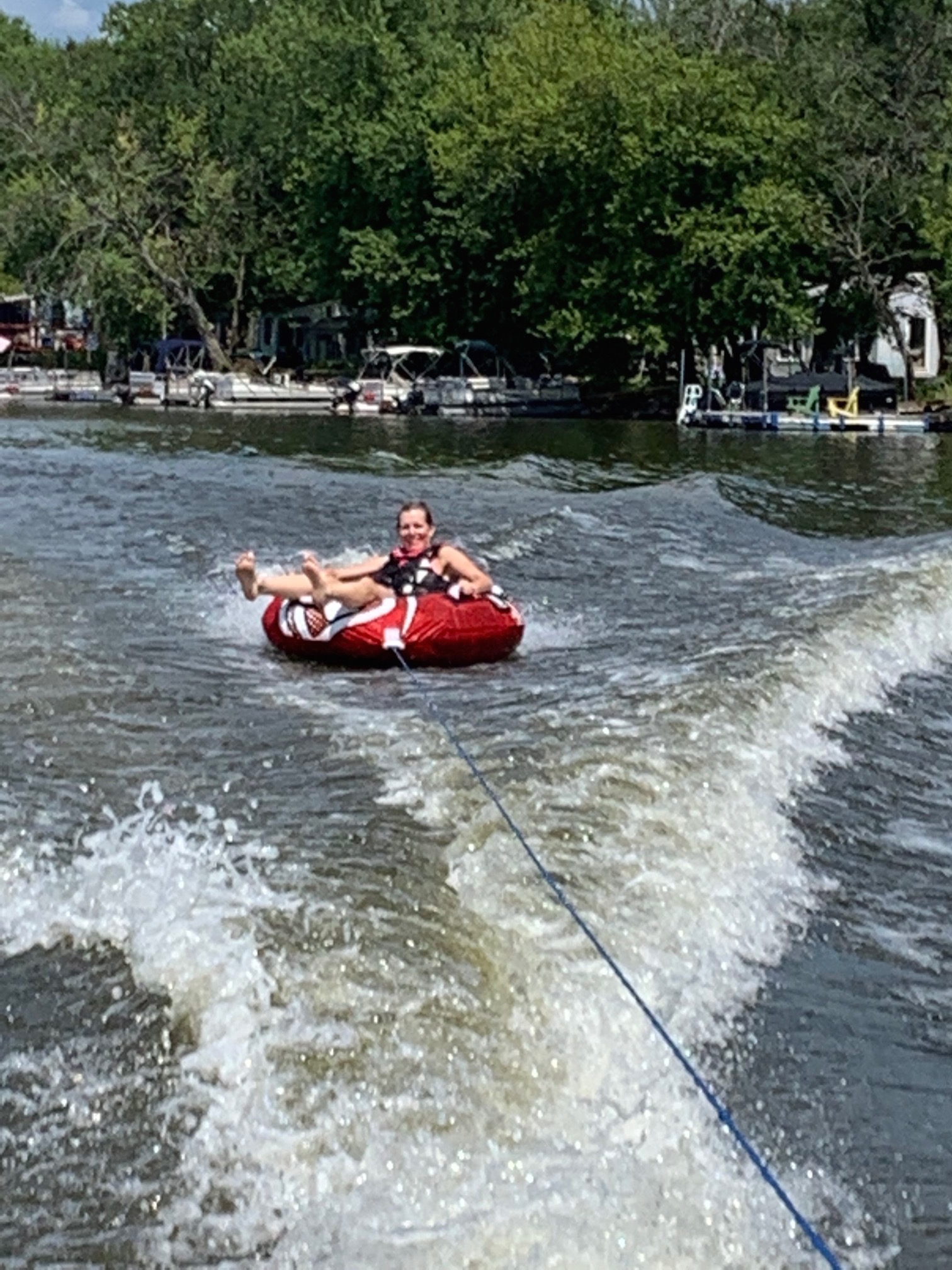 So I clambered back in the boat and agreed only to sit on an inner tube and be pulled around the water like a chunk of pale ham on top of a bagel. It was fun. Nothing else got hurt. The clouds were pretty in the blue sky and my wife had a laugh watching me hang on for dear life.