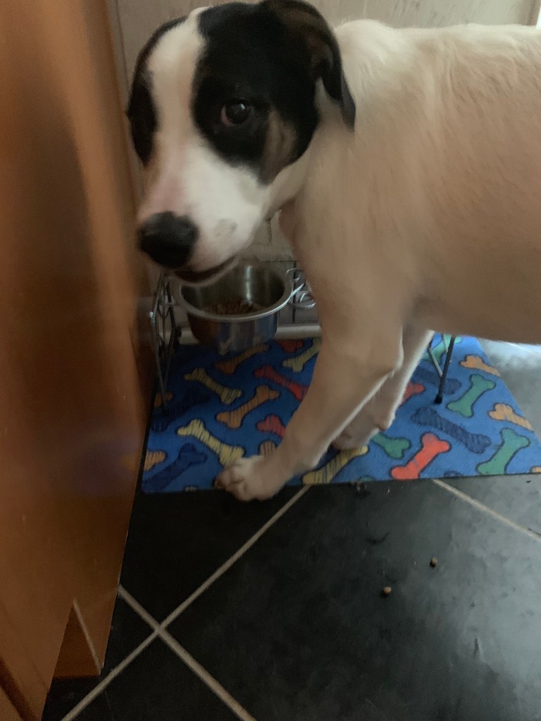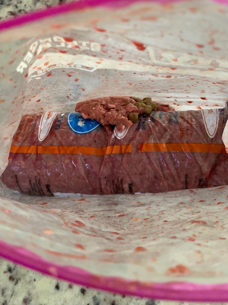 One of the things we learned early on is that pups like Lucy value certain types of food or objects higher than others. These “high value” items include larger rawhide bones but also the ground red meat we’ve introduced into her diet.