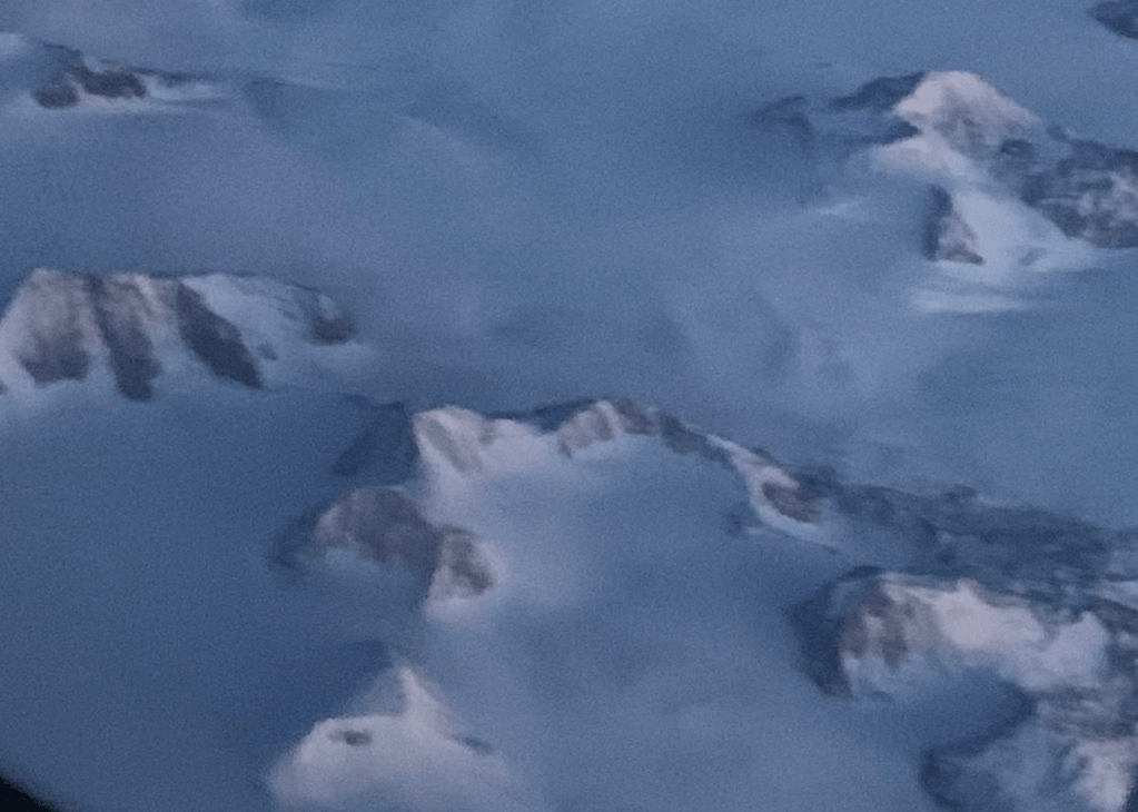 It is hard to imagine such events until you actually fly over the land mass of Greenland and see how covered in ice it truly is. This past Sunday our flight back from Munich, Germany took us straight across the snowy guts of Greenland. We were chasing the sunset for six to eight hours, so there was ample time to study the peaks of mountains jutting up from the surface of Greenland. We could see glaciers too, rivers of ice with terminal walls where sediments were dumped.