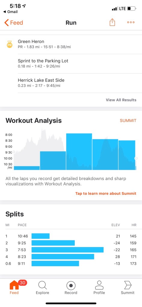 Yet today on the trails at Herrick Lake Forest Preserve I pushed the pace and dipped below an eight-minute mile for a good chunk of the run. I even ran near 8:00 pace on the largely uphill fourth mile. That made me feel good even when I thought back to the fact that just three or four years ago I raced 7:00 pace for 10k.