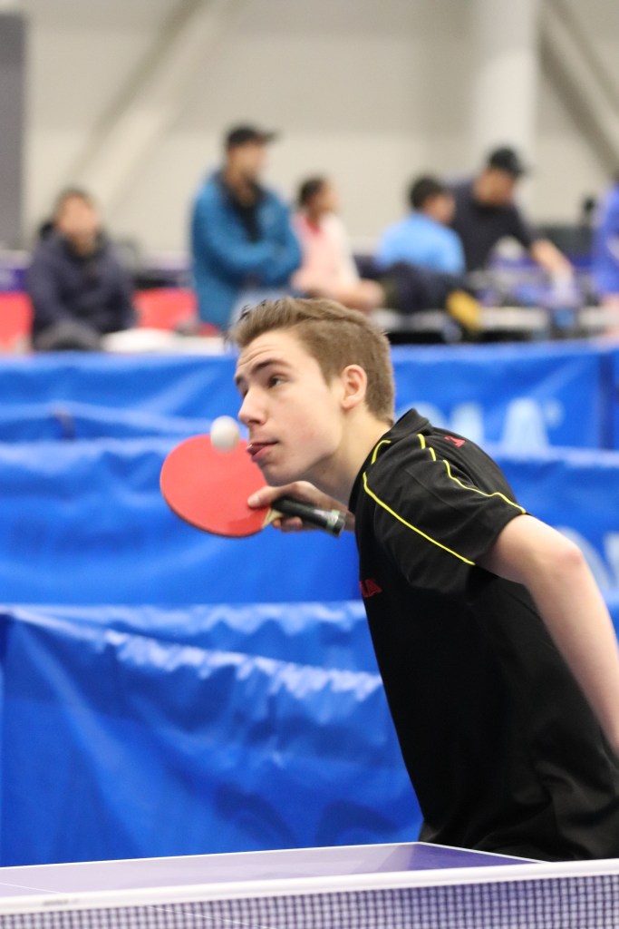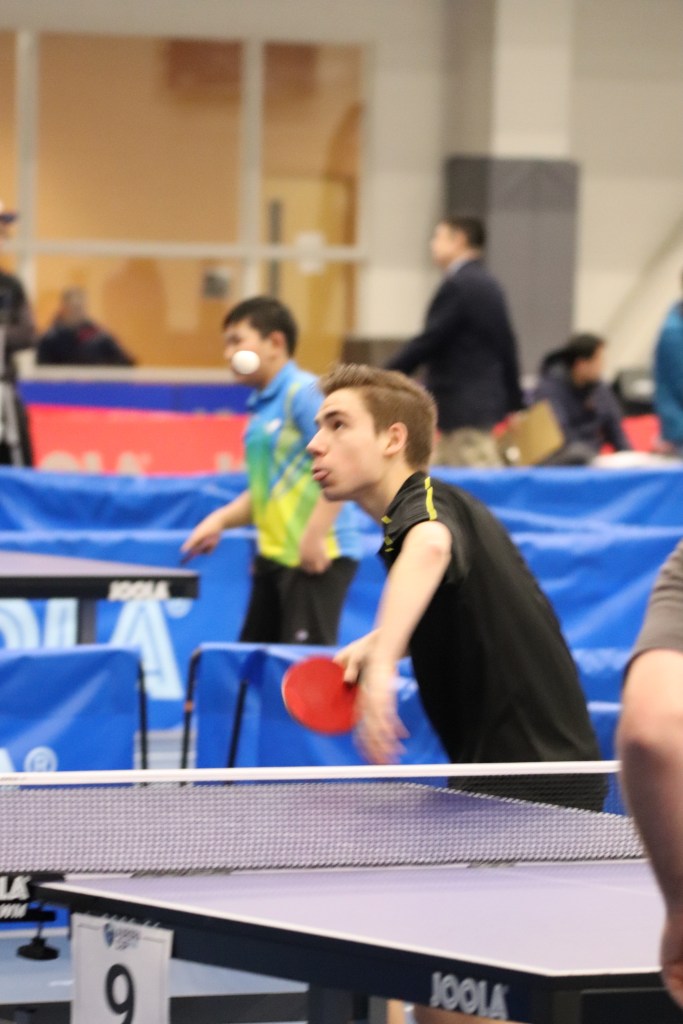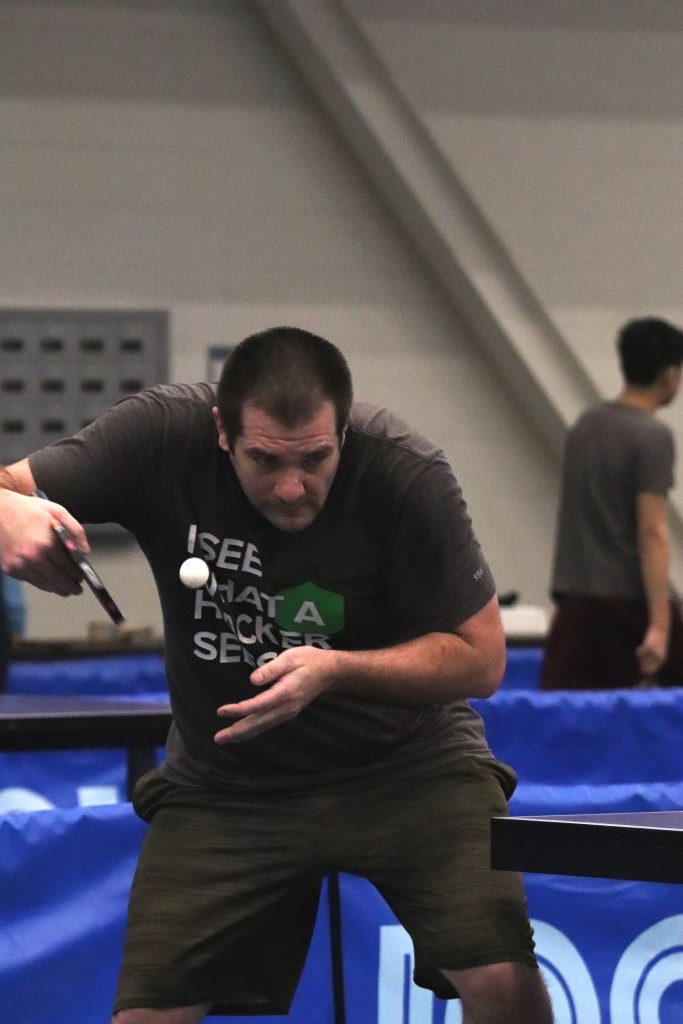 Which is why the set up at the Vaughn Center this weekend for the Aurora Open was so impressive in terms of its detail. The organizers even hoisted sheets of black plastic up to the roofline to block out southern window exposure. It would not do to have nearly world-class players trying to see through glare on the tables. There was plenty of room around every table for players to retrieve or set up shots. The new style of table tennis balls is plastic, I was told, not comprised of the same flammable material from which they were once constructed. I’ll admit to burning a few table tennis balls for the fun of it back in the day. The chemical flames had a liquid lick to them, perfect foil for a childlike pyromaniac.