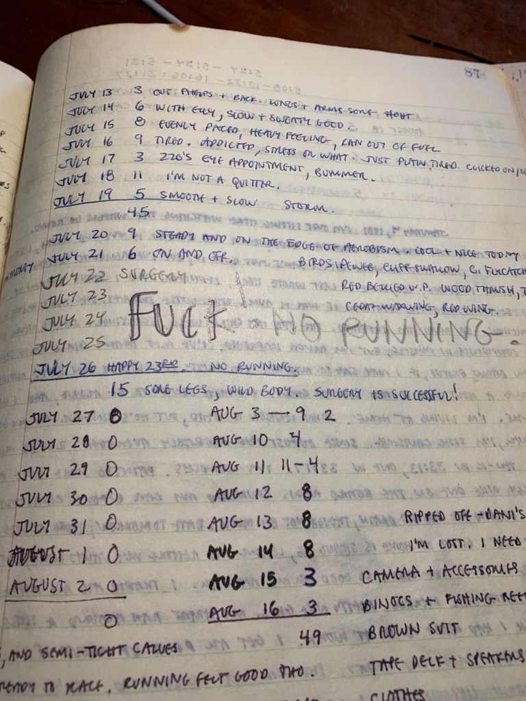 The surgery was July 22 and I was told not to run for a week or so. Up until that point I’d been averaging 45-50 miles a week in a post-collegiate training regimen that was fitful and desperate because I’d been working as an Admission counselor driving all over the state of Illinois recruiting students for my alma mater.