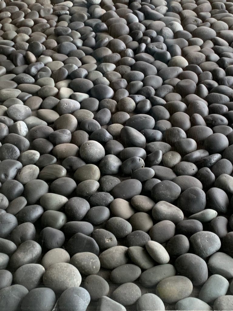 Today I walked to the edge of the building to look outside. One of the interesting features of the architecture is the layers of smooth stones used to cover the roof just outside the windows. There are thousands of these stones resting in place and yet their patterns also suggest movement.
