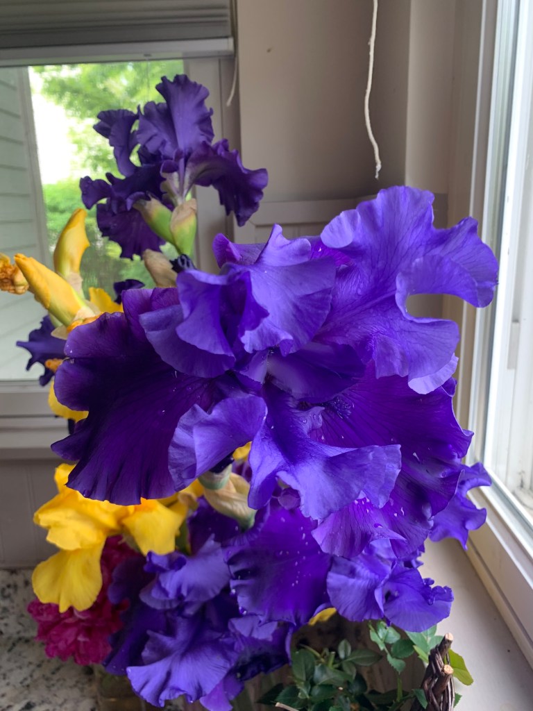 All around our house the irises are in bloom. There are deep purple and light, yellow and Japanese iris all in full regalia. As some of the yellow ones tipped over with the weight of wind and rain, she clipped them to bring a bunch inside. I’m so grateful for that. They stopped me in place to look them over today.