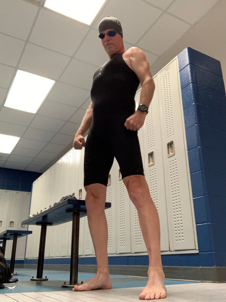 In anticipation of the race, my wife Sue gave me a Roka skinsuit in advance of my birthday this Sunday. I tried it out in the pool on Wednesday and while it’s not as buoyant as the Roka wetsuit shorts I own, or the sleeveless wetsuit I’ve typically worn in races, it is an interesting and sleek piece of gear.