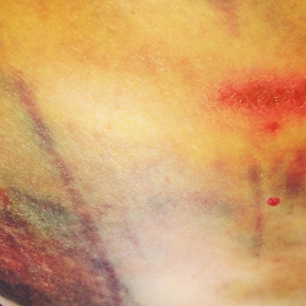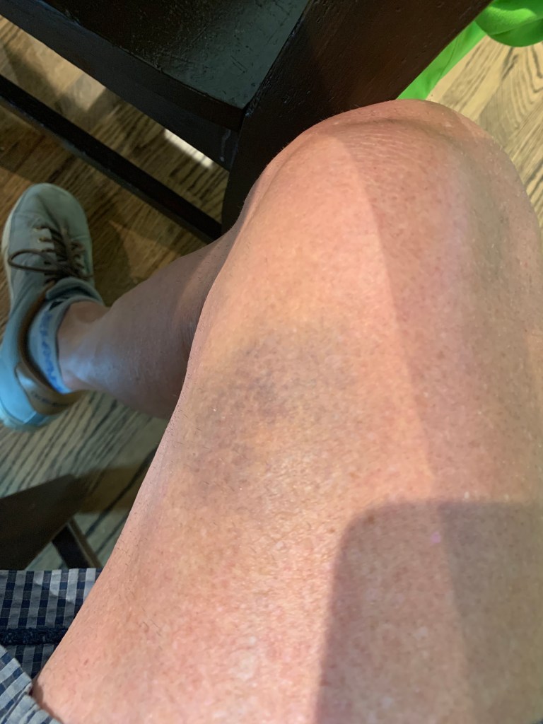 Standing up, I could sense my neck was strained from landing high on my shoulders on the grassy incline. I also knew the soreness would increase. The next day my body was stiff and tight. There was a bruise on my upper thigh. It was turning purple in the nearly exact place that I injured that leg during a higher speed fall due to bike wobble way back in 2012. I was going forty miles an hour that day, and through all that panick of speed and the inevitable crash, it was hard-earned athletic instincts and fast awareness that enabled me to yank my feet out of the clips. The bike frame struck me on the same part of my thigh just above the knee. Funny how those things happen.