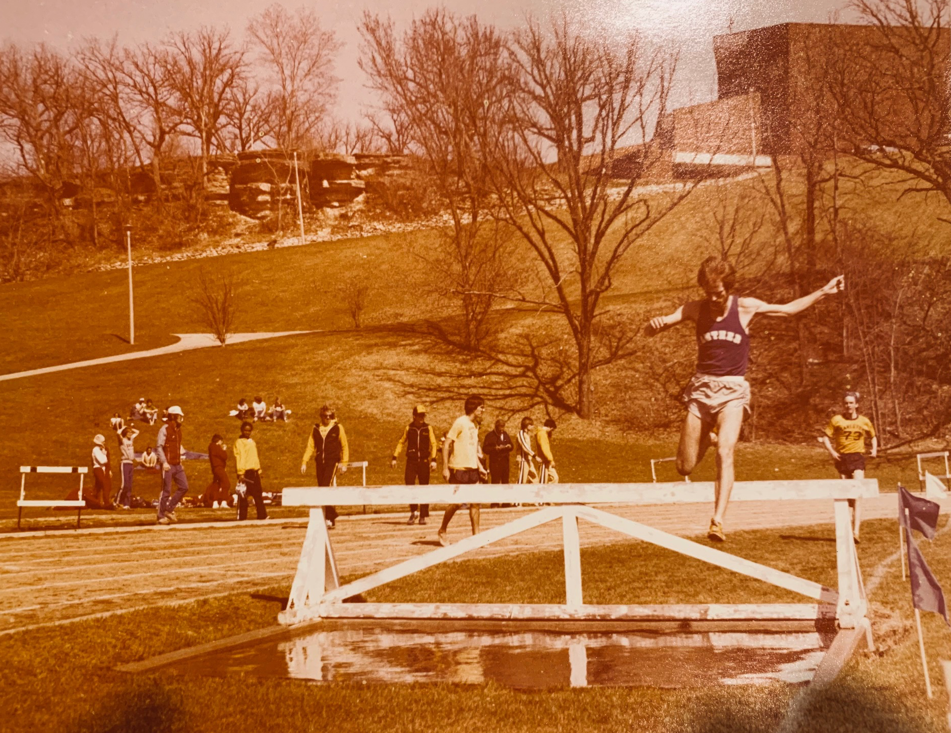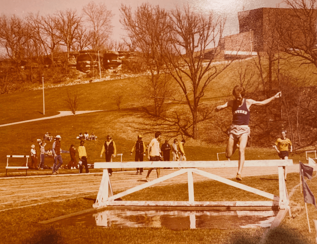 By the time I was a sophomore in college, I gave up field events such as HJ, LJ and TJ entirely because a new focus had taken over my track career. That was steeplechase, the event in which distance runners cover 3000 meters over 35 barriers and 7 water jumps. My jumping ability helped with the hurdling. Where it really helped was clearing the water jump. The pit was 2.5 feet deep below the barrier and rose to a zero depth incline twelve feet away. I’d step on the barrier and leap out and over the water, often without getting even one foot wet.