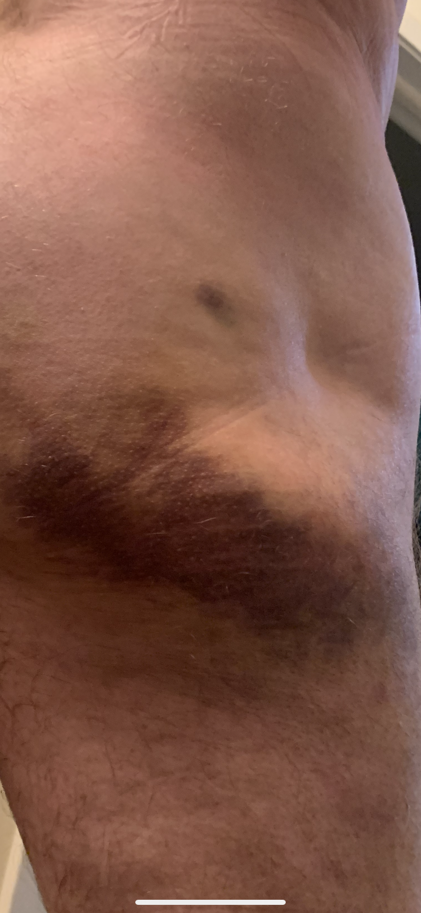 After all that cold weather running yesterday in which the cold wind stung my face, I traveled to the dermatologist this morning for a six-month checkup after having a small bit of skin cancer taken off my right arm last summer. The doctor looked me over from the waist up. I laughed telling him that I had a bit purple bruise on my butt, and showed him the greenish bruise on my right forearm after sliding out the bike last weekend. He’s a cyclist too, and we commiserated about the vagaries of winter riding. That bruise on my butt is a work of art!
