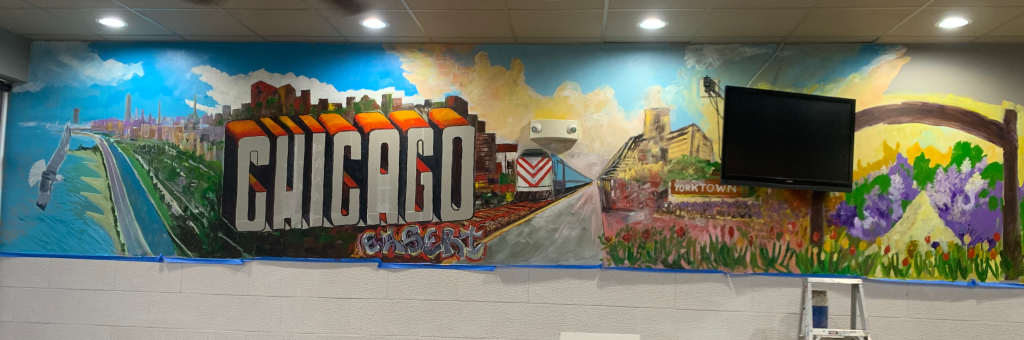 I’m not getting athletically fitter or improving aerobically, but it is satisfying work nonetheless. The mural is separated into a Chicago side and a Lombard side. Tying the two together creative is the main focus of the project.