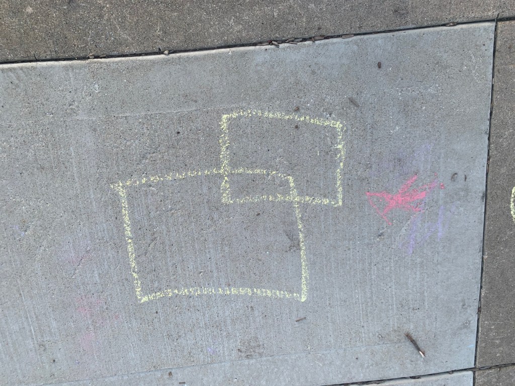 That’s why the sidewalk drawing caught my eye. What if that space where the two rectangles intersect is a portal between two realities? What if that’s what we’re supposed to find to gain meaning in life?