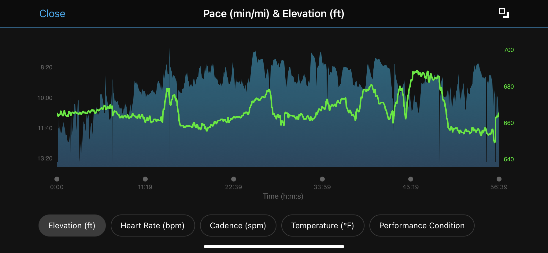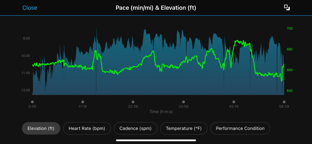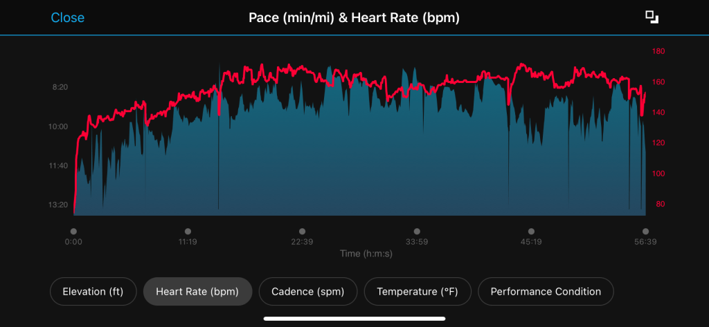 Important note: it was 76+ degrees at the start and finished near 86. Pretty hot, and heat accelerates the heart like nothing else. The hills were a factor too. You can see the impact of the climbs in this pace-per-mile (gray) versus elevation (green) data chart. That last big hump toward the end of the run is the rise through a forest preserve that ends with a 400 yard downhill onto the flats next to the Fox River.