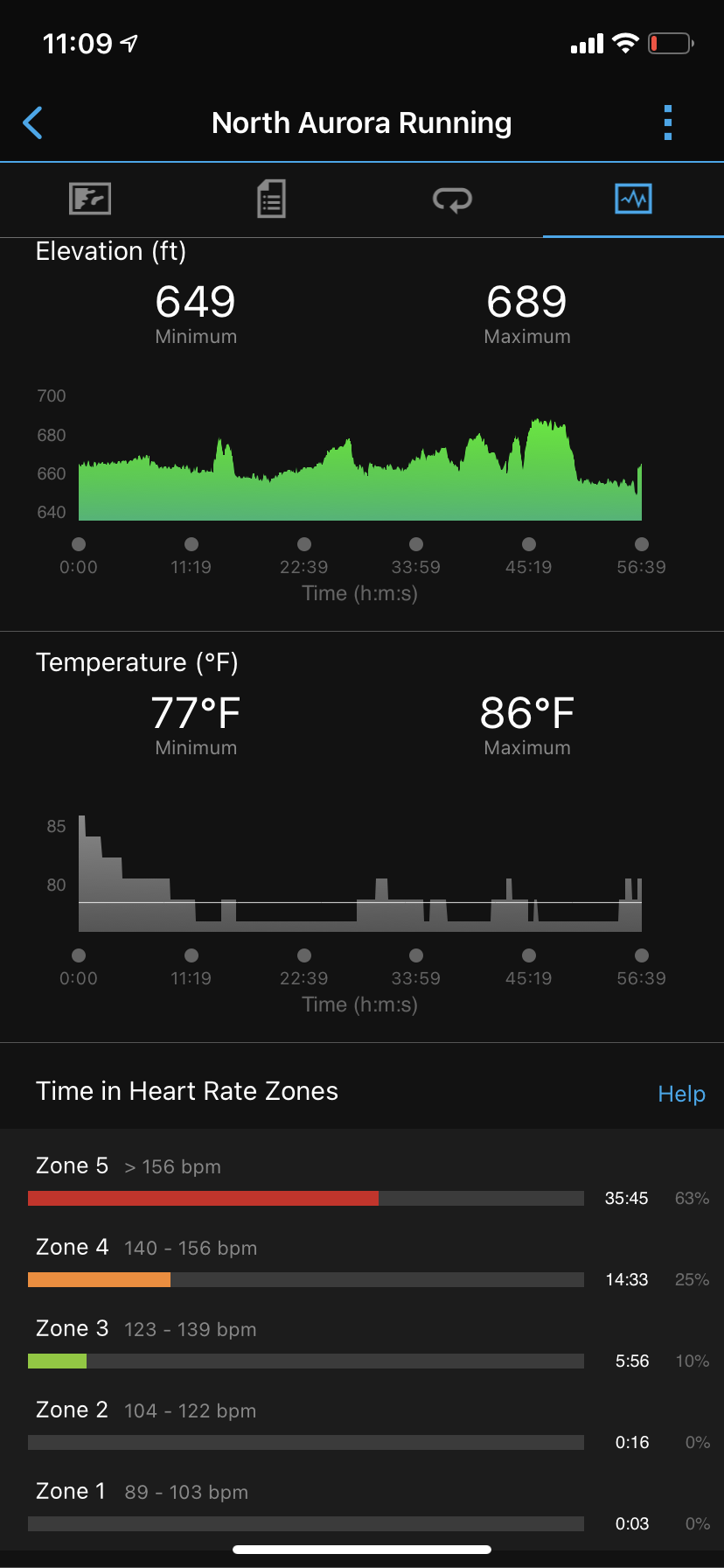 While I didn’t sink to a complete jog, I could not wait to finish that run yesterday. The Zone chart tells why. I spent quite a bit of time in the Red Zone with a heart rate above 150 bpm, which is what I expected from a relatively hard effort on a hot day.