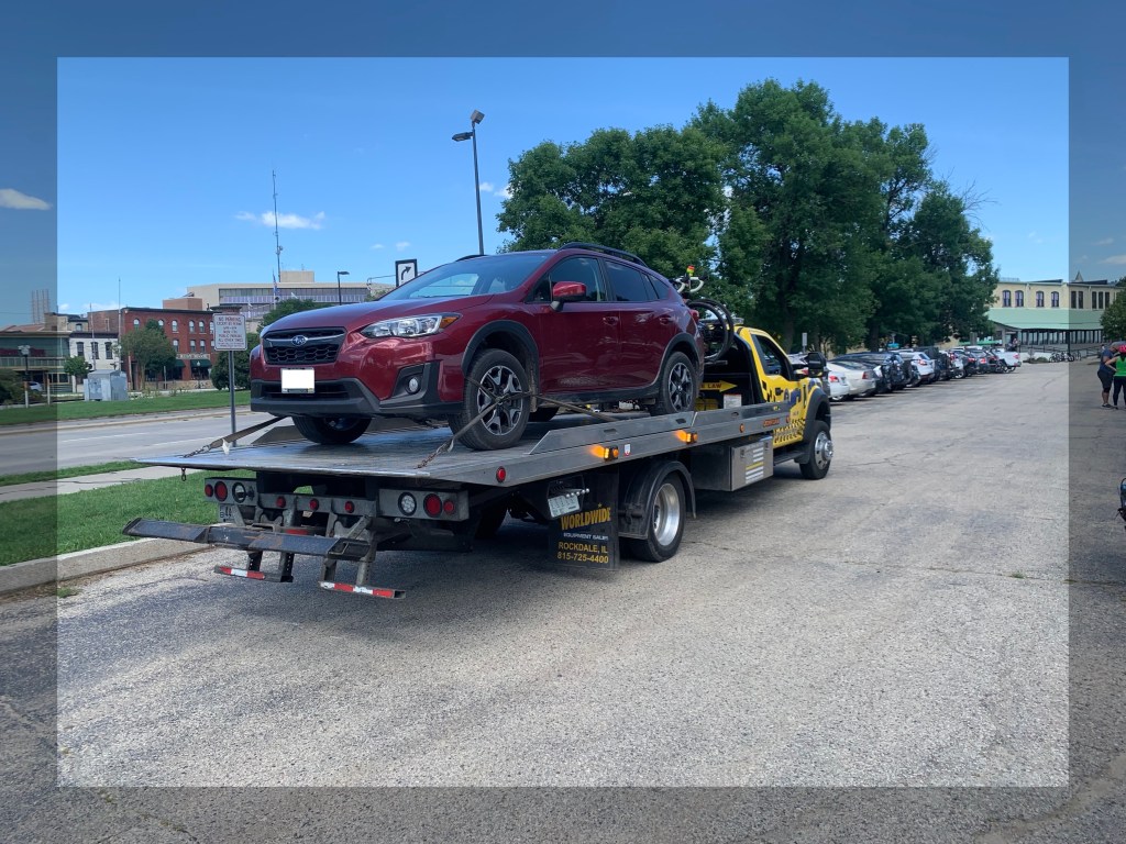 We discussed what they planned to do and I offered to drive them anywhere they wanted to go. The two truck arrived and the stuck Subaru they own was dragged onto the flatbed truck and they decided to go with their Crosstrek to the dealership and get things resolved.