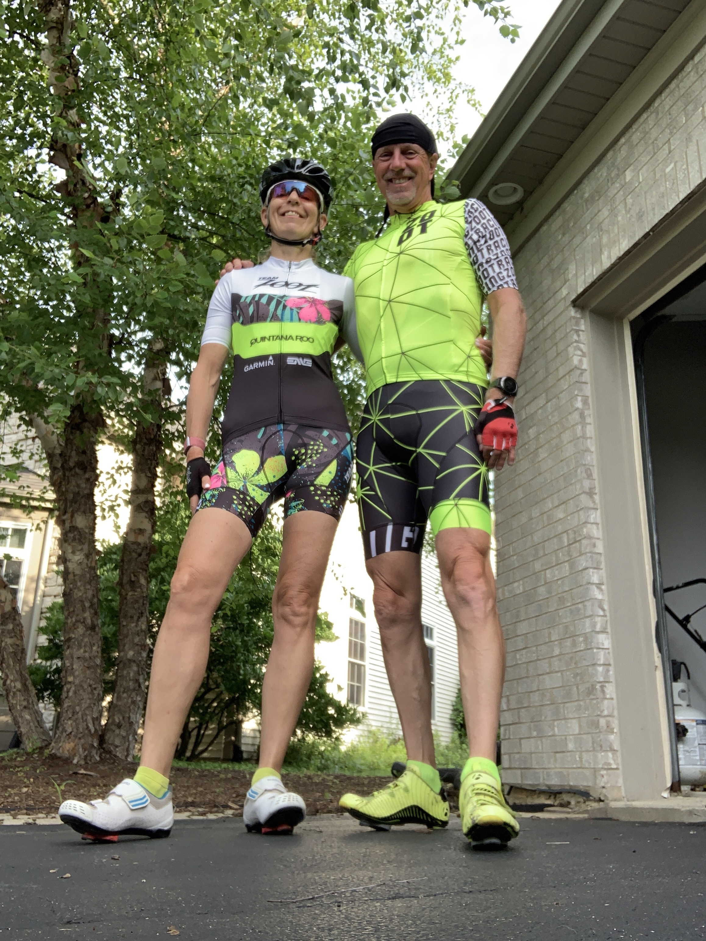 Once we got on our bikes, the morning air was cool and pleasant just like the lake water. The sun was up and Sue’s Zoot suit shone like a blue-green gem as she pedaled ahead of me. She bought me a complementary kit and added this gem of kit for herself for our riding.