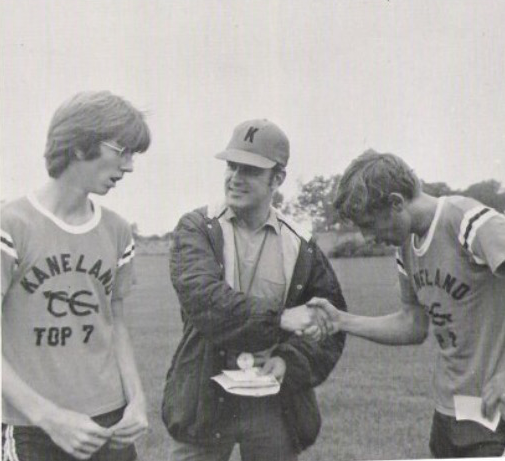 Chris Cudworth with Kaneland coach Richard Born and top runner Bill Creamean in fall of 1972.