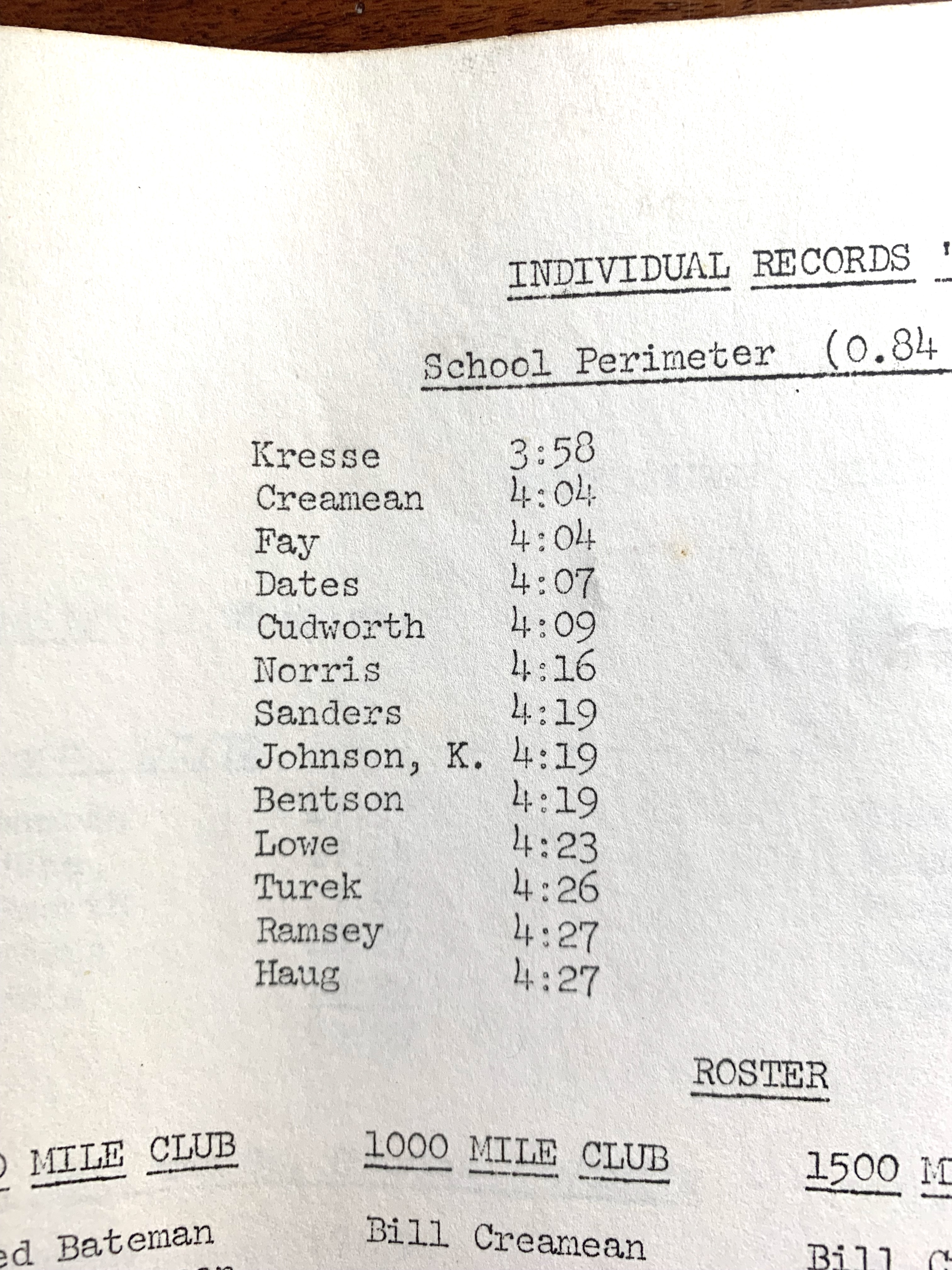 I wasn’t the fastest guy on that perimeter loop. My teammates Kirk Kresse, Bill Creamean, Jim Fay and Merid Dates all bested me. But the confidence it gave us all to run under 4:10 for that loop was enough to set us up for other successes, to prepare for race pace knowing you had even more in the tank if necessary. For the kick, especially. Not only could we feel the improvement, now we could see it. Right there. In Black and White. It told us, “You’re faster now.”