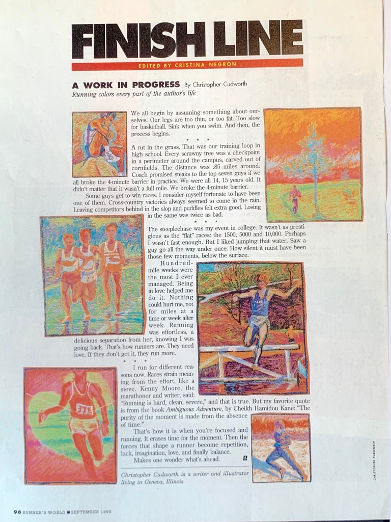 One of the measures of potential success were the times we posted for the Campus Perimeter. We’d start on the track and head west to the grass along Meredith Road, then turn south in a long, arcing path around the ring of trees surrounding the south end of campus. I wrote about this experience in the illustrated article I published in Runner’s World in the late 1990s. It read, “A rut in the grass. That was our training loop in high school. Every scrawny tree was a checkpoint in a perimeter around the campus, carved out of cornfields.”