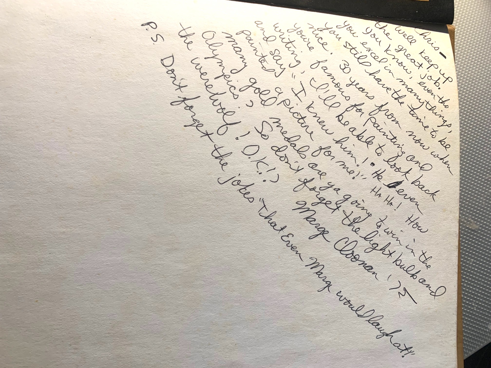 It reads: Well, keep up the great job. You know, even though you excel in many things, you still have the time to be nice. 30 years from now when you’re famous for painting and writing, I’ll be able to look back and say “I knew him! He even painted a picture for me! ” Ha ha! How many gold medals are ya going to win in the Olympics? So don’t forget the light bulb and the werewolf! O.K.! Marge Cloonan ’75 .P.S. don’t forget the jokes “That even Marge would laugh at.!”