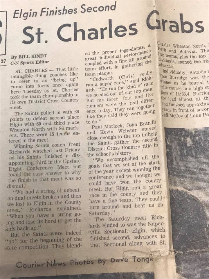 Looking at the newspaper clippings and photos from that era, I realized how times have changed in so many respects. The coverage on cross country meets given by local newspapers was gratifying through both the wins and the losses. Bill Kindt of the Beacon News was a longtime sportswriter among many in the Chicago suburbs who dedicated their lives to covering high school sports. I later contracted with him at the Beacon to write a yearlong series of nature articles for the newspapers.