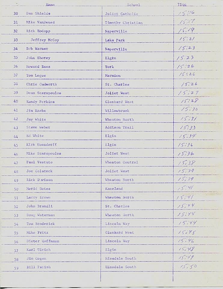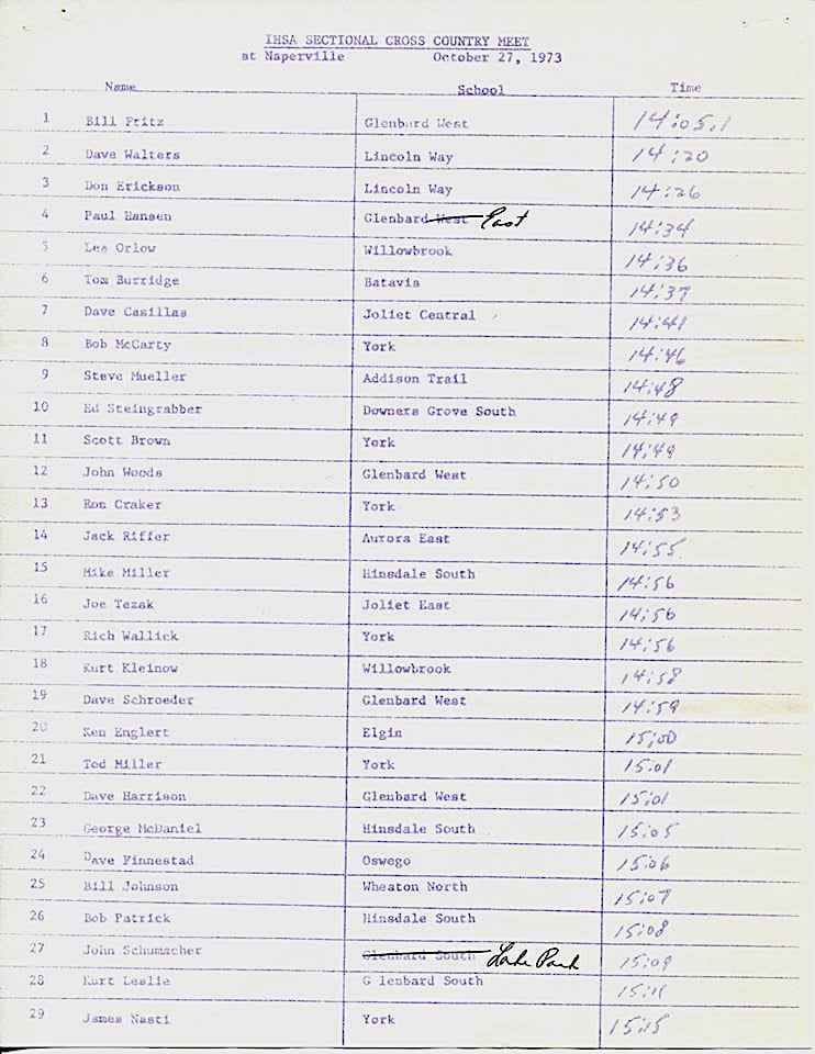 That day would arrive in a few years for both St. Charles East and St. Charles North, the two schools that emerged from the single high school serving the community through 1978 or so. As it was, I ran 15:26 at that Sectional, a credible time but nothing spectacular. I finished 20+ seconds behind Elgin’s Ken Englert and a few seconds behind his teammate John Shorey. The big names in Illinois running at that time dominated the day: Bill Fritz in 14:05. Dave Walters in 14:20 and Batavia’s Tom Burridge moving downstate in 14:37.