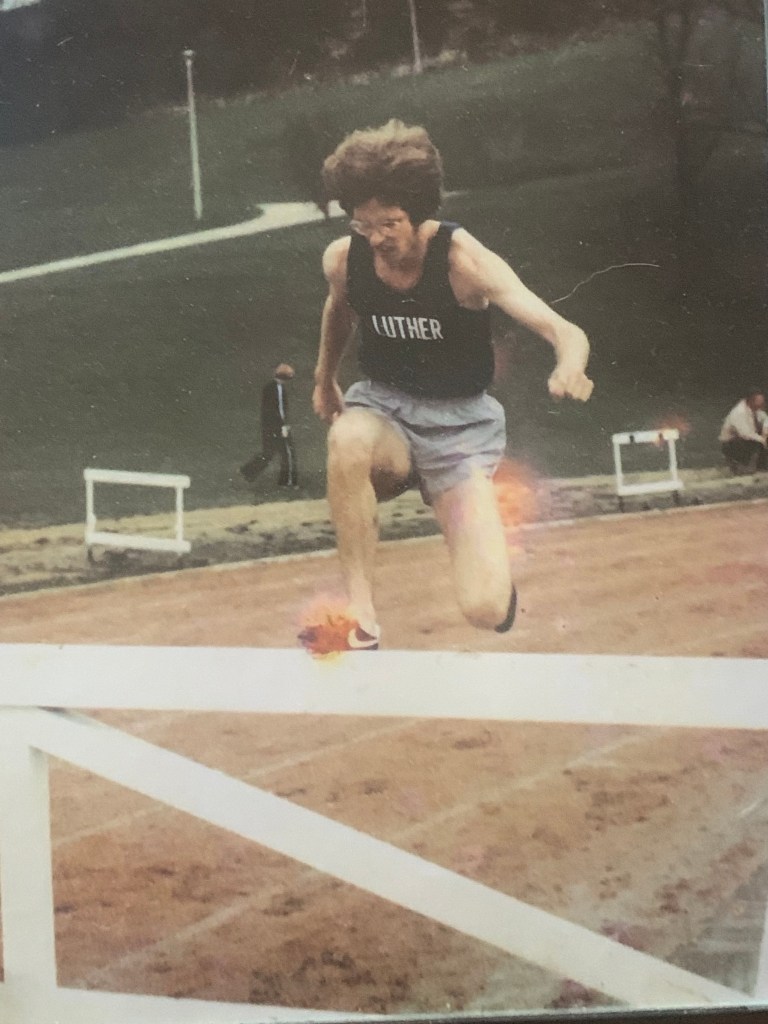 I’d been a forty-foot triple-jumper in high school, so I had good hops. My hurdling form needed work, as I’d not hurdled much before college. But in terms of inspiration, I was following in the footsteps of a cross country teammate Dave Hanson. He’d been an All-American steepler for Luther the year before.