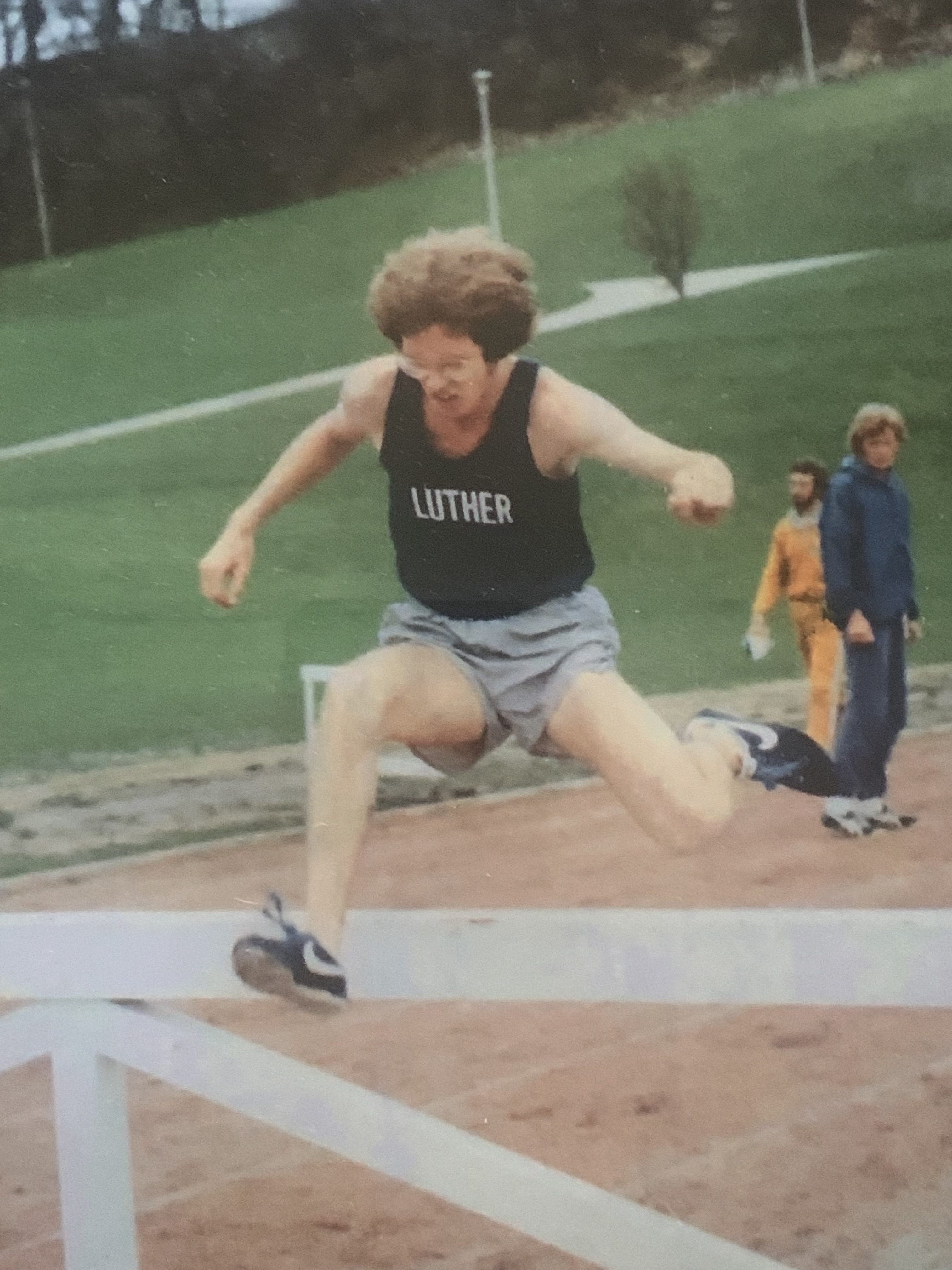 I’d been a forty-foot triple-jumper in high school, so I had good hops. My hurdling form needed work, as I’d not hurdled much before college. But in terms of inspiration, I was following in the footsteps of a cross country teammate Dave Hanson. He’d been an All-American steepler for Luther the year before.