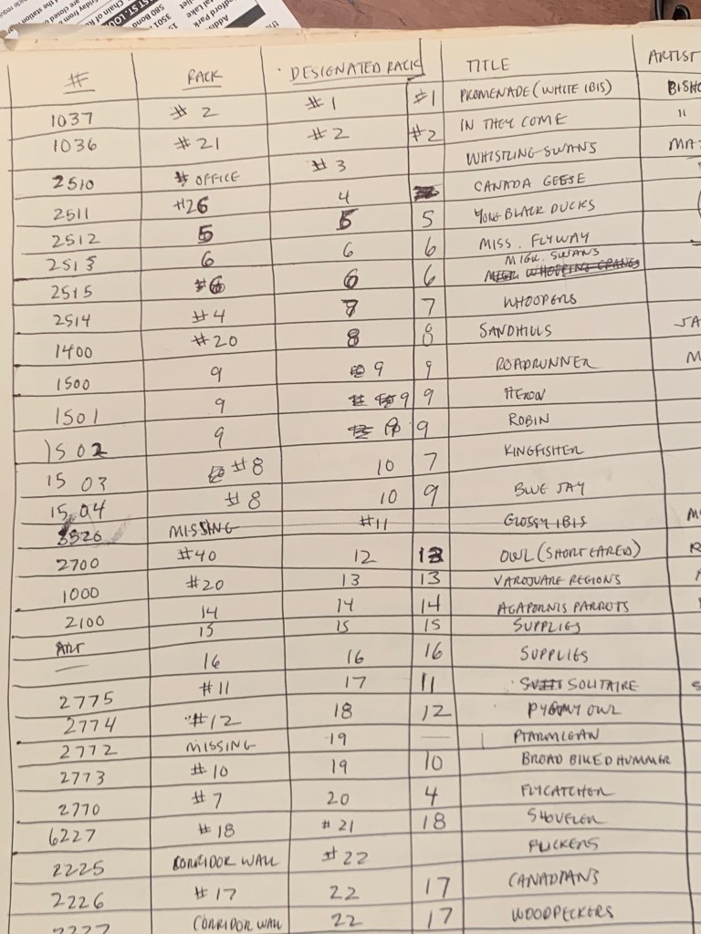 But I was happy. In the morning, I’d sometimes walk the mile from the house to the Lab on the quiet road covered with fresh new snow. It was a daily wonderland because it snowed almost every night that I stayed there. I’d go to the Lab at 7:30 in the morning and pore through bird art the entire day, making lists of what they owned while recording the images and their artists in a ledger. It felt like I was doing something important, and actually, I was.