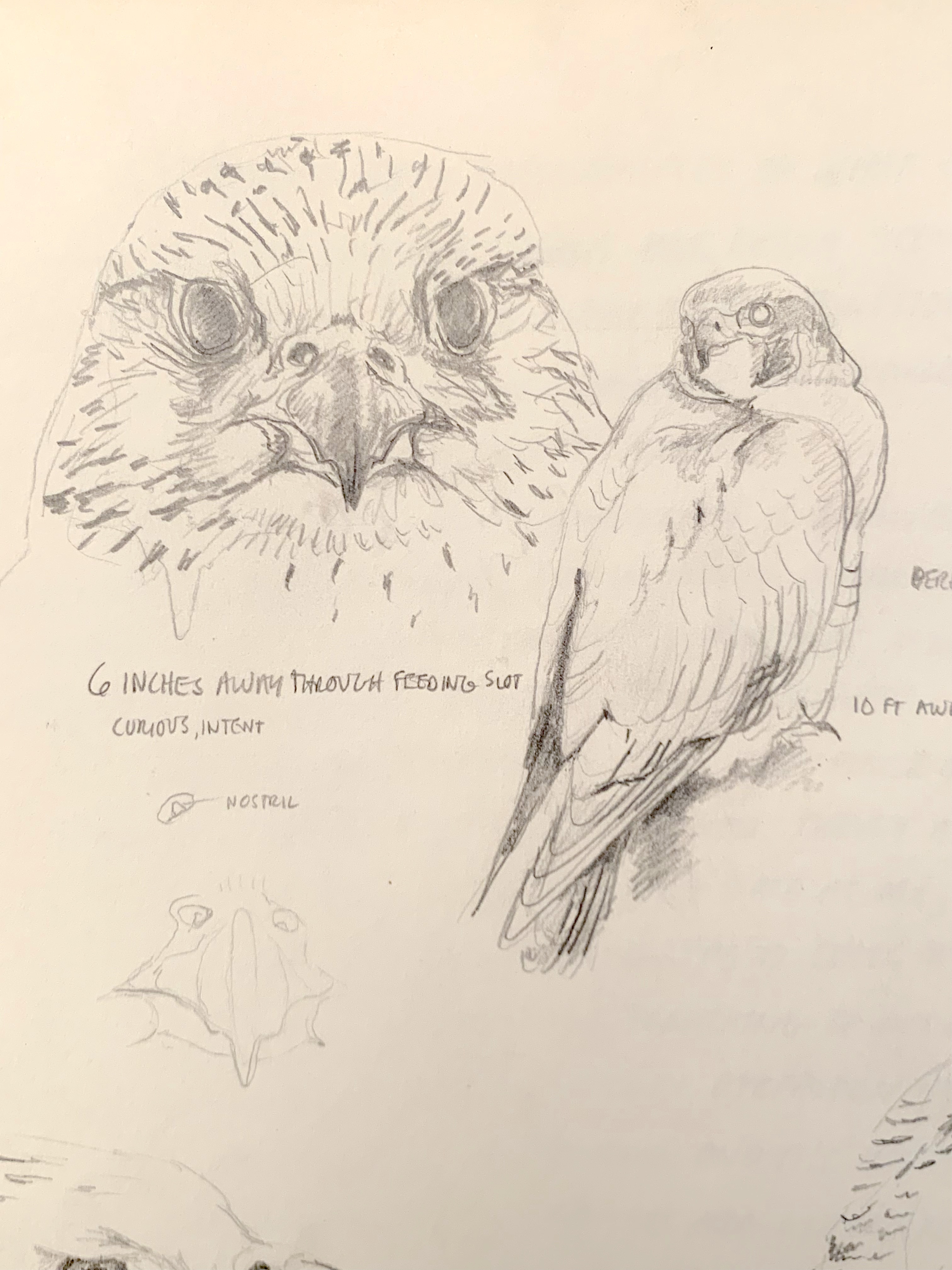 Several days were spent drawing falcons at the Hawk Barn, a series of buildings and pens where peregrine falcons and gyrfalcons were being captive-bred to restore their populations in the wild. Those species had been devastated by the presence of DDT in the environment, so the opportunity to study these birds up close was prized. I stood face-to-face looking at a gyrfalcon through a small window. That image (above) is one of the prized drawings in my entire life.