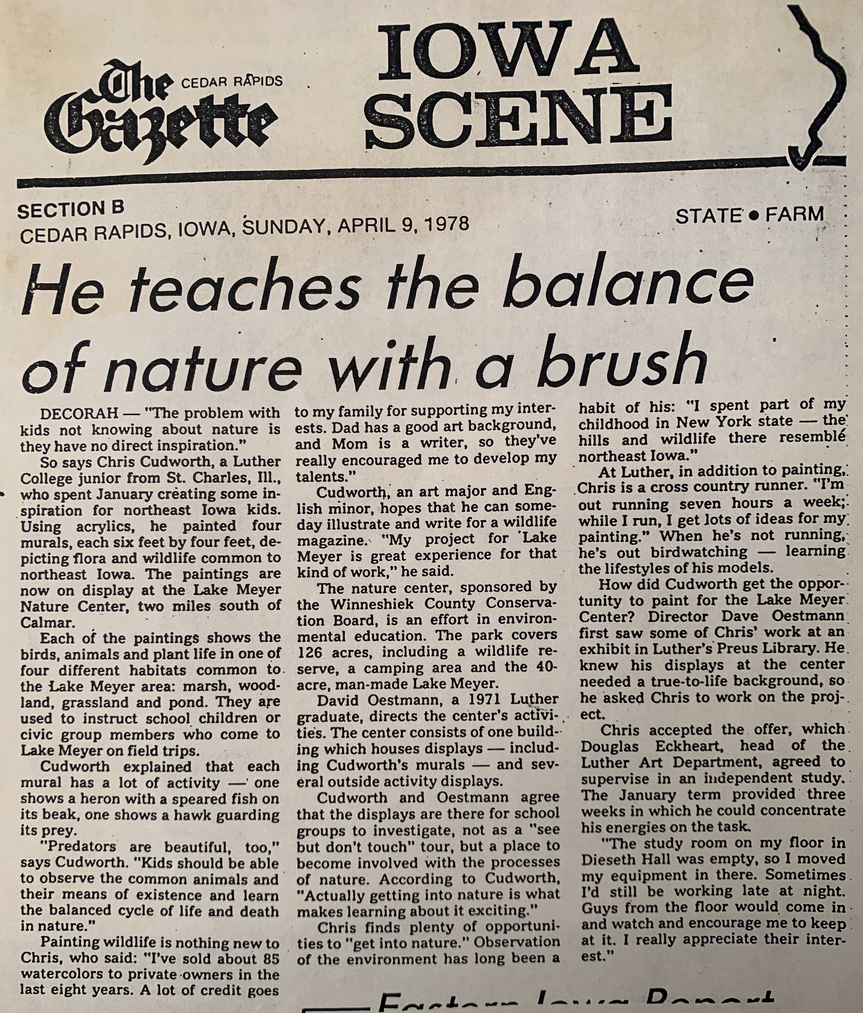 Once I got past the negativity in my mind, things began to change. Heading back to school that winter, I grew excited about taking on a massive January Term project, painting four 4′ X 8′ murals for the Lake Meyer Nature Center in Calmar, Iowa. Back on campus, I threw myself into that project day and night, often working long hours as guys on the dorm floor sat watching me paint as they drank beer or pontificated in the middle of a strong pot buzz.